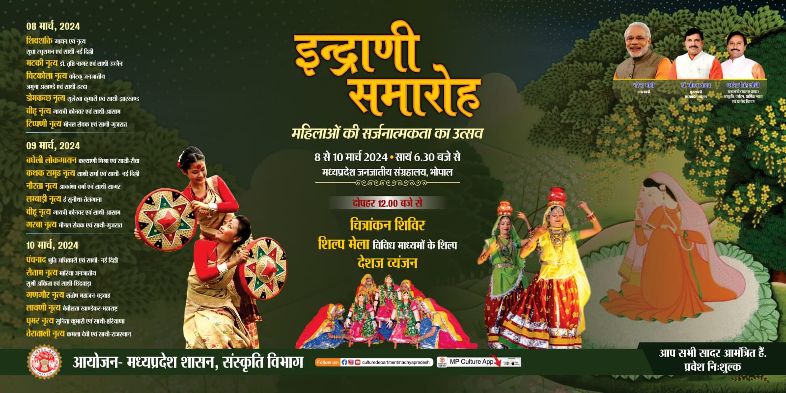 इन्द्राणी समारोह महिलाओं की सर्जनात्मकता का उत्सव 8 से 10 मार्च 2024 • सायं 6.30 बजे से मध्यप्रदेश जनजातीय संग्रहालय, भोपाल दोपहर 12.00 बजे से चित्रांकन शिविर शिल्प मेला विविध माध्यमों के शिल्प देशज व्यंजन आयोजन- मध्यप्रदेश शासन, संस्कृति विभाग
