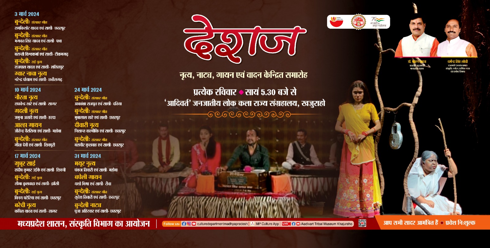 श्री रामकिशोर यादव, छतरपुर (बुन्देली संस्कार गीत) श्री भगवत सिंह यादव, अजयगढ़ (बुन्देली संस्कार गीत) सुश्री बसन्ती विश्वकर्मा, टीकमगढ़ (बुन्देली संस्कार गीत) श्री राजपाल यादव, ललितपुर (बुन्देली राई नृत्य) श्री नरेन्द्र पोयाम, छत्तीसगढ़ (ग्वार नाचा नृत्स) 10 मार्च, 2024 श्री राघवेन्द्र खरे, सागर (नौरता नृत्य) श्री जमुना अखंडे, हरदा (गदली) श्री जीतेन्द्र चैरसिया, महोबा (आल्हा गायन) सुश्री गीता देवी, शिवपुरी (बुन्देली संस्कार गीत) 17 मार्च, 2024 श्री संदीप कुमार उईके, शिवनी (गुन्नूर साई) सुश्री सीमा कुशवाहा, सकरार (उ.प्र) (बुन्देली संस्कार गीत) श्री विनय पटेरिया, बडामलहरा (बुन्देली संस्कार गीत) श्री कपिल यादव, सागर (बरेदी नृत्य) 24 मार्च, 2024 सुश्री आकांक्षा राजपूत, दतिया (बुन्देली संस्कार गीत) श्री मुन्नालाल खरे, गढी मलहरा (बुन्देली संस्कार गीत) श्री निशान्त वाल्मीक, बीजावर (दीवारी नृत्य) श्री बलवीर कुशवाह (बुन्देली संस्कार गीत) 31 मार्च, 2024 श्री पंकज तिवारी, महोबा (मयूर नृत्य) श्री यशो मिश्रा, रीवा (बघेली गायन ) श्री सुदेश तिवारी, पीरा-बमीठा छतरपुर (बुन्देली संस्कार गीत) सुश्री पूजा अहिरवार , छतरपुर ( बुन्देली नाट्य )