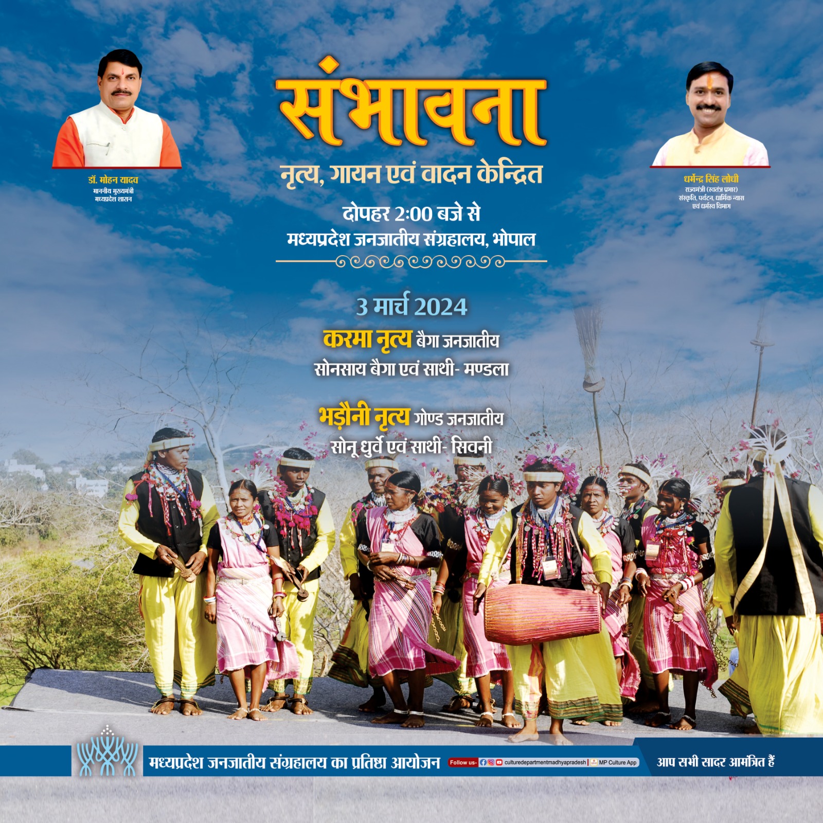 संभावना नृत्य, गायन एवं वादन केन्द्रित सायं 2.00 बजे से मध्यप्रदेश जनजातीय संग्रहालय, श्यामला हिल्स, भोपाल मध्यप्रदेश जनजातीय संग्रहालय का प्रतिष्ठा आयोजन