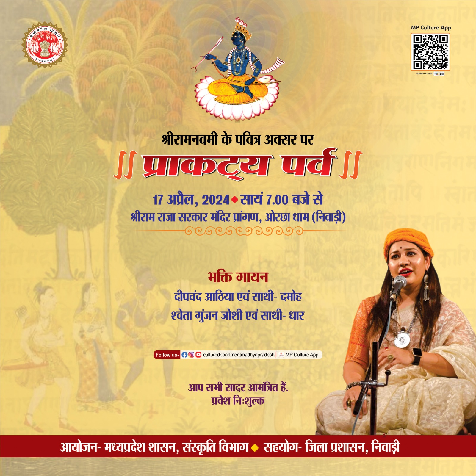 श्री रामनवमी के पावन अवसर पर 17 अप्रैल, 2024 को शहडोल, उमरिया, पन्ना, अमरकंटक, चित्रकूट एवं ओरछा धाम में आयोजित होगा, "प्राकट्य पर्व।" मध्यप्रदेश शासन, संस्कृति विभाग का यह प्रतिष्ठित आयोजन विभिन्न जिला प्रशासन के सहयोग से किया जाएगा। दर्शकगण भक्ति गायन, लीला नाटक एवं नृत्य नाटिका का आनंद ले सकेंगे। इन कार्यक्रमों में प्रवेश निःशुल्क है और आप सादर आमंत्रित हैं। आप अवश्य आएं और मर्यादा पुरुषोत्तम श्रीराम का आशीष पाएं। "जय श्रीराम!"