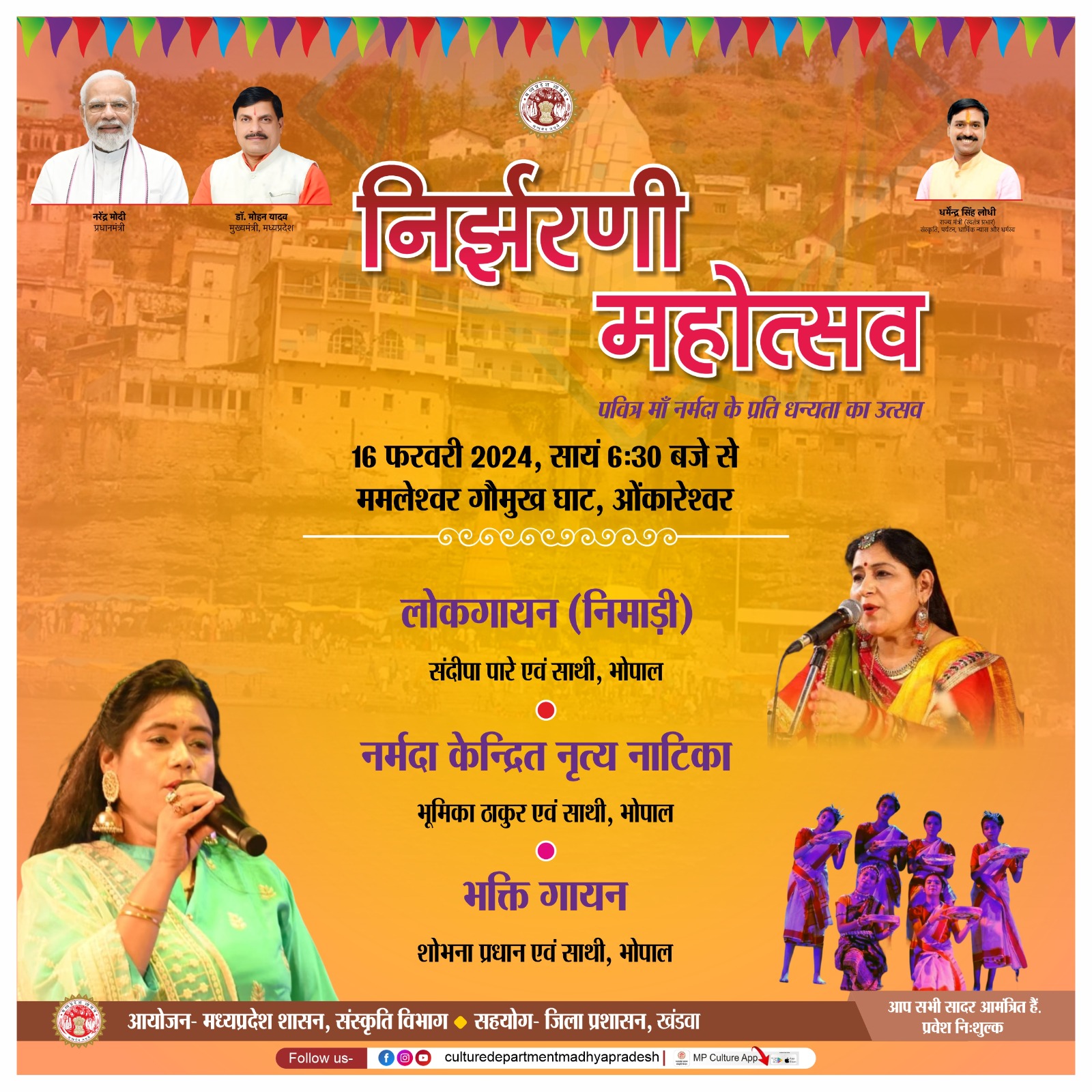 मध्यप्रदेश शासन, संस्कृति विभाग का प्रतिष्ठा आयोजन “निर्झरणी महोत्सव” 15-16 फरवरी, 2024 को होगा। पवित्र मां नर्मदा के प्रति धन्यता का उत्सव नर्मदापुरम, जबलपुर, नरसिंहपुर, देवास, ओंकारेश्वर, मंडलेश्वर, धार एवं बड़वानी में आयोजित होगा। इस दौरान विभिन्न कलाकार लोक गायन, नृत्य-नाटिका, भक्ति गायन के कार्यक्रम प्रस्तुत करेंगे। इन कार्यक्रमों में प्रवेश निःशुल्क है। आप सभी सादर आमंत्रित हैं।