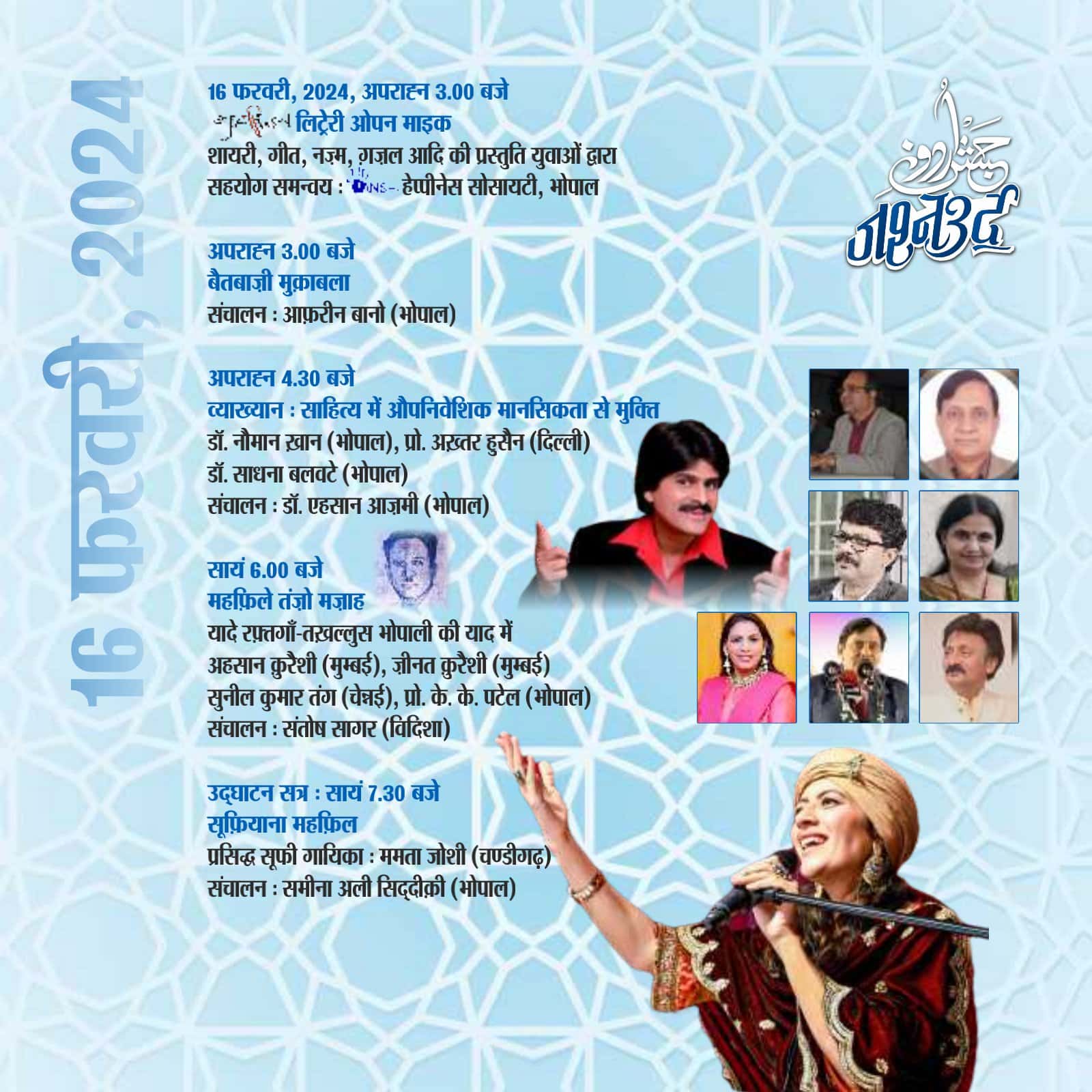 #Jashn_e_Urdu_2k24 #mpurduacademy #mpculturedeptt Culture Department Madhya Pradesh Mpculture Bpl मध्य प्रदेश उर्दू अकादमी, संस्कृति परिषद संस्कृति विभाग द्वारा *'साहित्य में औपनिवेशिक मानसिकता से मुक्ति'* थीम पर आधारित, तीन दिवसीय *जश्न ए उर्दू" 16,17 एवं 18 फ़रवरी 2024 को गौहर महल, वी आई पी रोड भोपाल में*। *माननीय श्री धर्मेंद्र भाव सिंह लोधी, मंत्री संस्कृति, पर्यटन, धार्मिक एवं धर्मस्व विभाग करेंगे आयोजन का उदघाटन। साथ ही श्री शिवशेखर शुक्ला, प्रमुख सचिव, संस्कृति एवं पर्यटन और संचालक संस्कृति श्री एन. पी. नामदेव की गरिमामय उपस्थिति रहेगी।* मध्य प्रदेश उर्दू अकादमी, संस्कृति परिषद, संस्कृति विभाग द्वारा 'साहित्य में औपनिवेशिक मानसिकता से मुक्ति' विषय पर आधारित तीन दिवसीय "जश्न ए उर्दू" माननीय श्री धर्मेंद्र भाव सिंह लोधी, मंत्री संस्कृति, पर्यटन, धार्मिक एवं धर्मस्व विभाग के मुख्यातिथ्य में 16,17 एवं 18 फ़रवरी 2024 को गौहर महल, भोपाल में आयोजित होगा । उर्दू अकादमी की निदेशक डॉ नुसरत मेहदी ने कार्यक्रम के बारे में जानकारी देते हुए कहा कि मध्य प्रदेश उर्दू अकादमी का यही प्रयास है कि अकादमी द्वारा जो भी कार्यक्रम आयोजित किये जायें वे भाषा, साहित्य एवं संस्कृति के संवर्द्धन, संरक्षण एवं विकास की दृष्टि से उद्देश्य पूर्ण हों। उर्दू अकादमी ने वर्ष भर सम्पूर्ण प्रदेश में उपरोक्त उद्देश्यों को दृष्टिगत रखते हुए कार्यक्रम आयोजित किए, उसी सिलसिले की एक कड़ी है जश्न ए उर्दू । इस बार का यह जश्न "साहित्य में औपनिवेशिक मानसिकता से मुक्ति" थीम पर आधरित है जिसमें अनेक महत्वपूर्ण विषयों पर आधारित व्याख्यान, संवाद एवं सेमिनार इत्यादि आयोजित होंगे। साथ ही सूफियाना महफ़िल, रक्से सूफियाना, अखिल भारतीय मुशायरा, चिलमन मुशायरा शायरात, महफ़िले तंज़ो मिज़ाह, प्रादेशिक मुशायरा, बैतबाजी, ओपन माइक, केलीग्राफ़ी, प्रदर्शनी एवं पुस्तक मेला आदि भी कार्यक्रम के मुख्य आकर्षण होंगे। इस अवसर पर विश्व विख्यात विद्वानों, लेखकों, फ़िल्म एवं थियेटर के कलाकारों से भी रूबरू हुआ जा सकेगा । उक्त तीन दिवसीय आयोजन में सभी साहित्यप्रेमी व कलाप्रेमी सादर साग्रह आमंत्रित हैं। डॉ नुसरत मेहदी निदेशक #Note: Jashne Urdu men hone wale Seminars men online registration karke shamil hone wale Students /Research scholars aur professors ko certificate diye jaayenge. Online registration link neeche he