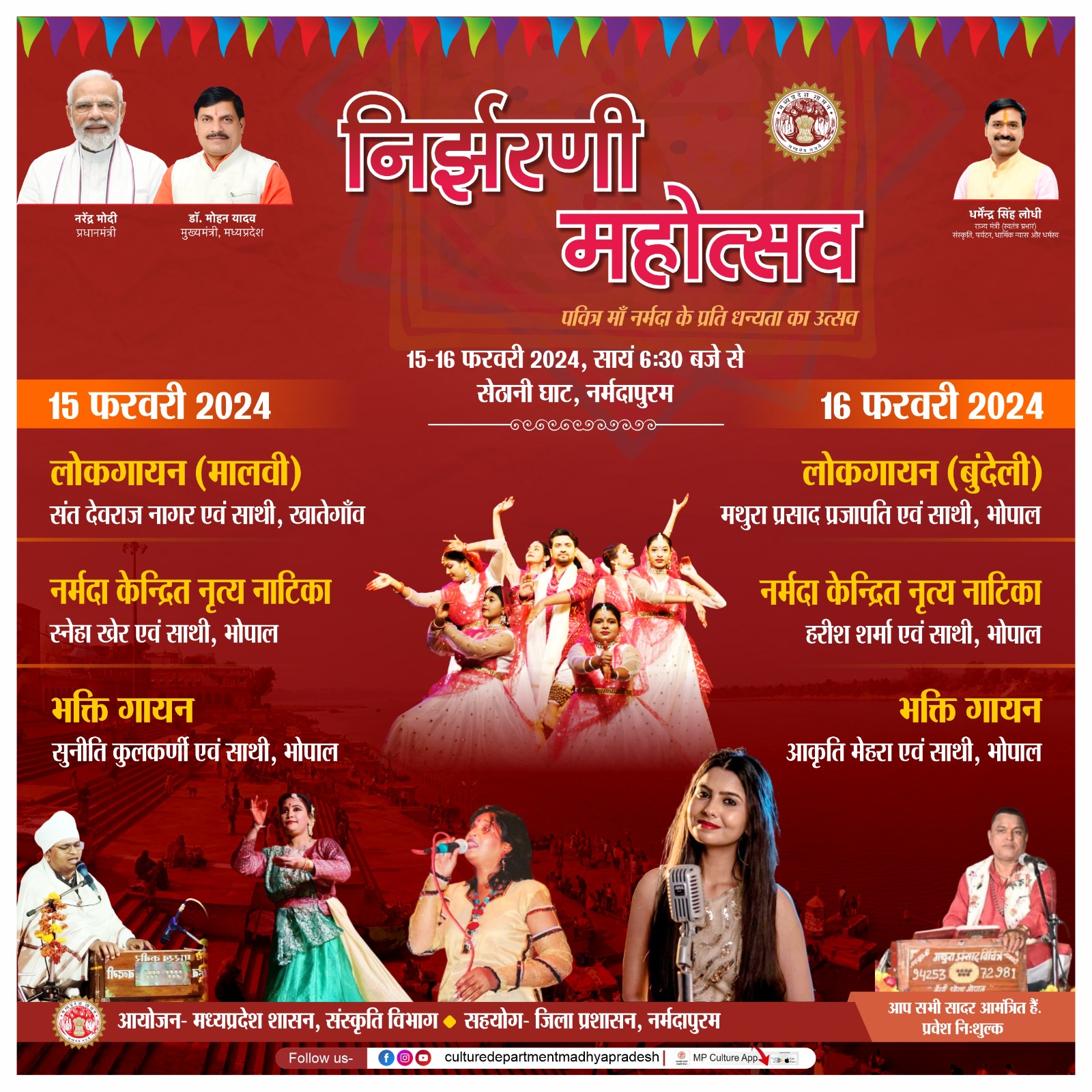 मध्यप्रदेश शासन, संस्कृति विभाग का प्रतिष्ठा आयोजन “निर्झरणी महोत्सव” 15-16 फरवरी, 2024 को होगा। पवित्र मां नर्मदा के प्रति धन्यता का उत्सव नर्मदापुरम, जबलपुर, नरसिंहपुर, देवास, ओंकारेश्वर, मंडलेश्वर, धार एवं बड़वानी में आयोजित होगा। इस दौरान विभिन्न कलाकार लोक गायन, नृत्य-नाटिका, भक्ति गायन के कार्यक्रम प्रस्तुत करेंगे। इन कार्यक्रमों में प्रवेश निःशुल्क है। आप सभी सादर आमंत्रित हैं।