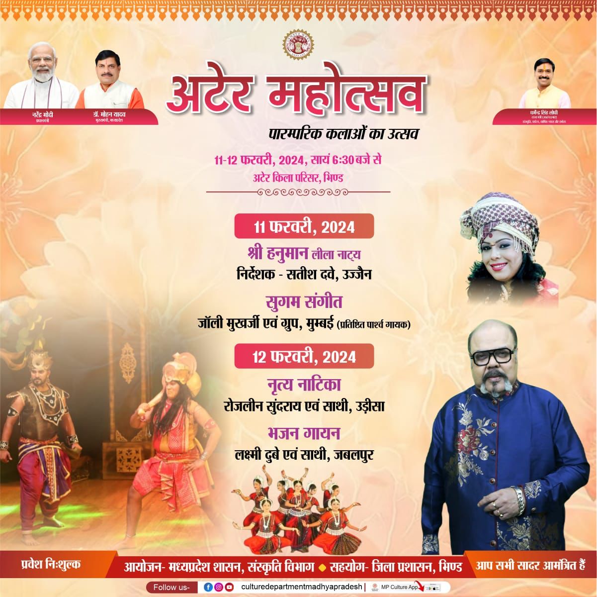 मध्यप्रदेश शासन, संस्कृति विभाग ज़िला प्रशासन भिंड के सहयोग से 11-12 फरवरी, 2024 को भिंड स्थित अटेर किला परिसर में "अटेर महोत्सव" आयोजित करने जा रहा है। पारंपरिक कलाओं के इस उत्सव में श्री हनुमान लीला नाट्य, सुगम संगीत, नृत्य नाटिका तथा भजन गायन का आयोजन होगा। प्रवेश निःशुल्क है। आप सादर आमंत्रित हैं।