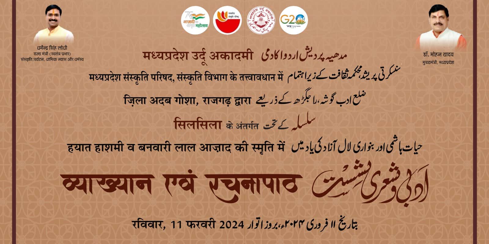 मध्यप्रदेश उर्दू अकादमी, मध्यप्रदेश संस्कृति परिषद, संस्कृति विभाग के तत्वावधान में ज़िला अदब गोशा, राजगढ़ द्वारा सिलसिला के अंतर्गत हयात हाशमी व बनवारी लाल आज़ाद की स्मृति में व्याख्यान एवं रचनापाठ रविवार, 11 फरवरी 2024 नाटानी कैफ़े, शासकीय गर्ल्स स्कूल के सामने, ब्यावरा जिला-राजगढ़ सिलसिला : दोपहर 1:00 बजे विशिष्ट आमंत्रित वक्ता एवं शायर पंकज पलाश (शाजापुर) सिलसिला में आमंत्रित स्थानीय वक्ता एवं शायर वक्ता :- साजिद हाशमी शायर एवं साहित्यकार (विषय: हयात हाशमी व्यक्तित्व एवं कृतित्व) अरुण ' आज़ाद' - शायर (विषय बनवारीलाल आजाद व्यक्तित्व एवं कृतित्व) शायर :- दिनेश 'प्रभात', के.के. नाजां, कन्हैया 'राज', इश्तियाक़ जैदी, सत्येन्द्र भारिल्ल सखावत अंसरी, शाहिद सैफ़ी अश्क, अनुराग अर्श, राहुल शर्मा राहिल खलील कुरैशी, रेखा नायक 'रानी', रश्मि सक्सेना, मयंक गौड़ जिला समन्वयक : राहुल कुम्भकार ब्यावरा सहित ज़िले के समस्त काव्य सुधि श्रोतागण सादर साग्रह आमंत्रित हैं। डॉ. नुसरत मेहदी निदेशक