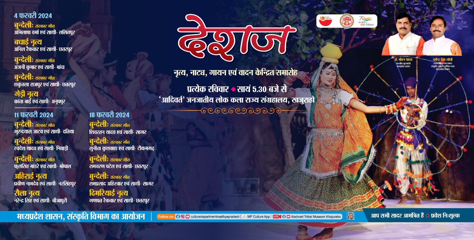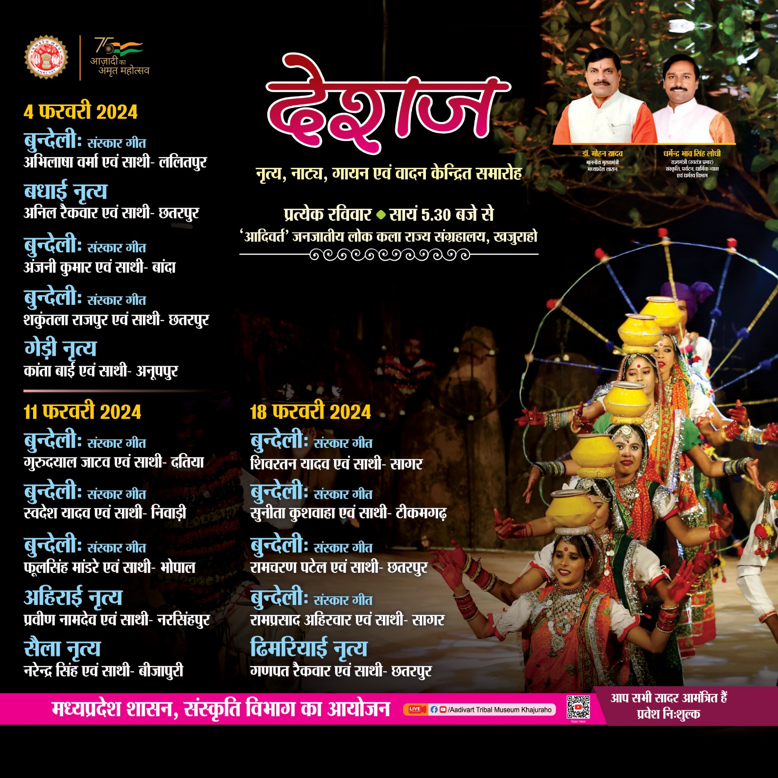 04 फरवरी, 2024 1. सुश्री अभिलाषा वर्मा, ललितपुर (बुन्देली संस्कार गीत) 2. श्री अनिल रैकवार, छतरपुर (बुन्देली बधाई नृत्य) 3 श्री अंजनी कुमार, बांदा (बुन्देली संस्कार गीत) 4. सुश्री शकुन्तला राजपूत, छतरपुर (बुन्देली संस्कार गीत) 5. सुश्री कान्ता बाई, अनूपपुर (गेड़ी नृत्य) 11 फरवरी, 2024 7 श्री गुरुदयाल जाटव, दतिया (बुन्देली संस्कार गीत) 8 श्री स्वदेष यादव, पृथ्वीपुर निमाड़ी (बुन्देली संस्कार गीत) 9. श्री फूल सिंह मांडरे, भोपाल (बुन्देली संस्कार गीत) 10 श्री प्रवीण नामदेव, गोटेगांव नरसिंहपुर (अहिारई नृत्य) 11. श्री नरेन्द्र सिंह, बीजापुरी (षैला नृत्य) 18 फरवरी, 2024 12. श्री षिवरतन यादव, सागर (बुन्देली संस्कार गीत) 13 सुश्री सुनीता कुषवाहा, टीकमगढ़ (बुन्देली संस्कार गीत) 14 श्री रामचरण पटेल, छतरपुर (बुन्देली संस्कार गीत) 15 श्री रामप्रसाद अहिरवार, सागर (बुन्देली संस्कार गीत) 16 श्री गणपत रैकवार, बमनौरा छतरपुर (ढिमरियाई नृत्य)