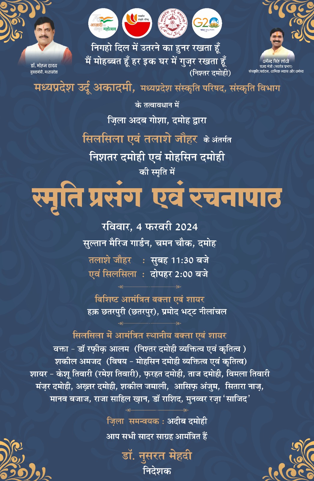 #Damoh_District #Silsila #Talashe_Jauhar #mpurduacademy Mpculture Bpl निगहो दिल में उतरने का हुनर रखता हूँ मैं मोहब्बत हूँ हर इक घर में गुज़र रखता हूँ (निश्तर दमोही) मध्यप्रदेश उर्दू अकादमी, मध्यप्रदेश संस्कृति परिषद, संस्कृति विभाग के तत्वावधान में जिला अदब गोशा, दमोह द्वारा सिलसिला एवं तलाशे जौहर के अंतर्गत निशतर दमोही एवं मोहसिन दमोही की स्मृति में स्मृति प्रसंग एवं रचनापाठ रविवार, 4 फरवरी 2024 सुल्तान मैरिज गार्डन, चमन चौक, दमोह तलाशे जौहर : सुबह 11:30 बजे एवं सिलसिला : दोपहर 2:00 बजे विशिष्ट आमंत्रित वक्ता एवं शायर हक़ छतरपुरी (छतरपुर), प्रमोद भट्ट नीलांचल सिलसिला में आमंत्रित स्थानीय वक्ता एवं शायर वक्ता - डॉ रफ़ीक़ आलम (निश्तर दमोही व्यक्तित्व एवं कृतित्व ) शकील अमजद (विषय- मोहसिन दमोही व्यक्तित्व एवं कृतित्व) शायर - केश तिवारी (रमेश तिवारी), फरहत दमोही, ताज दमोही, विमला तिवारी मंज़र दमोही, अख़्तर दमोही, शकील जमाली, आसिफ़ अंजुम, सितारा नाज़, मानव बजाज, राजा साहिल खान, डॉ राशिद, मुनव्वर रज़ा 'साजिद' जिला समन्वयक : अदीब दमोही आप सभी सादर साग्रह आमंत्रित हैं डॉ. नुसरत मेहदी निदेशक