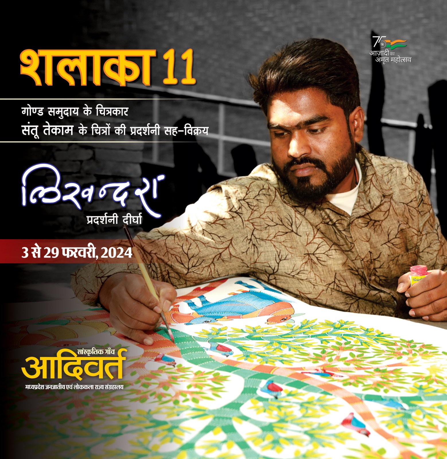 आदिवर्त जनजातीय संग्रहालय द्वारा प्रदेश के जनजातीय चित्रकारों को चित्र प्रदर्शनी और चित्रों की बिक्री के लिये सार्थक मंच उपलब्ध कराने की दृष्टि से प्रतिमाह 'लिखन्दरा प्रदर्शनी दीर्घा' में किसी एक जनजातीय चित्रकार की प्रदर्शनी सह विक्रय का संयोजन शलाका नाम से किया जाता है। इसी क्रम में 3 फरवरी, 2024 से गोंड समुदाय के चित्रकार श्री संतू तेकाम के चित्रों की प्रदर्शनी सह-विक्रय का संयोजन किया जा रहा है। 11 वीं शलाका चित्र प्रदर्शनी 29 फरवरी, 2024 (मंगलवार से रविवार) तक निरंतर रहेगी। गोण्ड चित्रकार संतू तेकाम का जन्म मध्यप्रदेश के जनजातीय बहुल डिण्डौरी जिले के पाटनगढ़ ग्राम में वर्ष 1989 में हुआ। बचपन जंगल-पहाड़ों से घिरे ग्रामीण वातावरण में गुजरा।