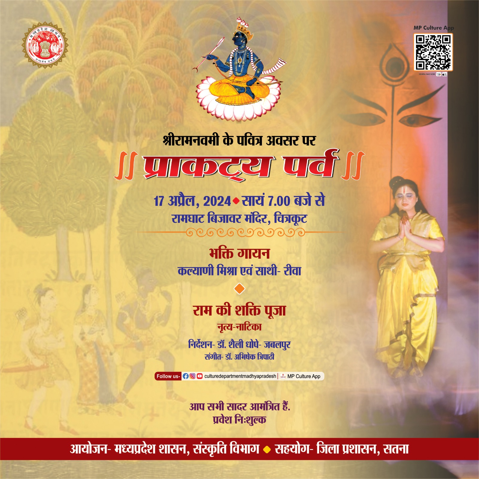 श्री रामनवमी के पावन अवसर पर 17 अप्रैल, 2024 को शहडोल, उमरिया, पन्ना, अमरकंटक, चित्रकूट एवं ओरछा धाम में आयोजित होगा, "प्राकट्य पर्व।" मध्यप्रदेश शासन, संस्कृति विभाग का यह प्रतिष्ठित आयोजन विभिन्न जिला प्रशासन के सहयोग से किया जाएगा। दर्शकगण भक्ति गायन, लीला नाटक एवं नृत्य नाटिका का आनंद ले सकेंगे। इन कार्यक्रमों में प्रवेश निःशुल्क है और आप सादर आमंत्रित हैं। आप अवश्य आएं और मर्यादा पुरुषोत्तम श्रीराम का आशीष पाएं। "जय श्रीराम!"