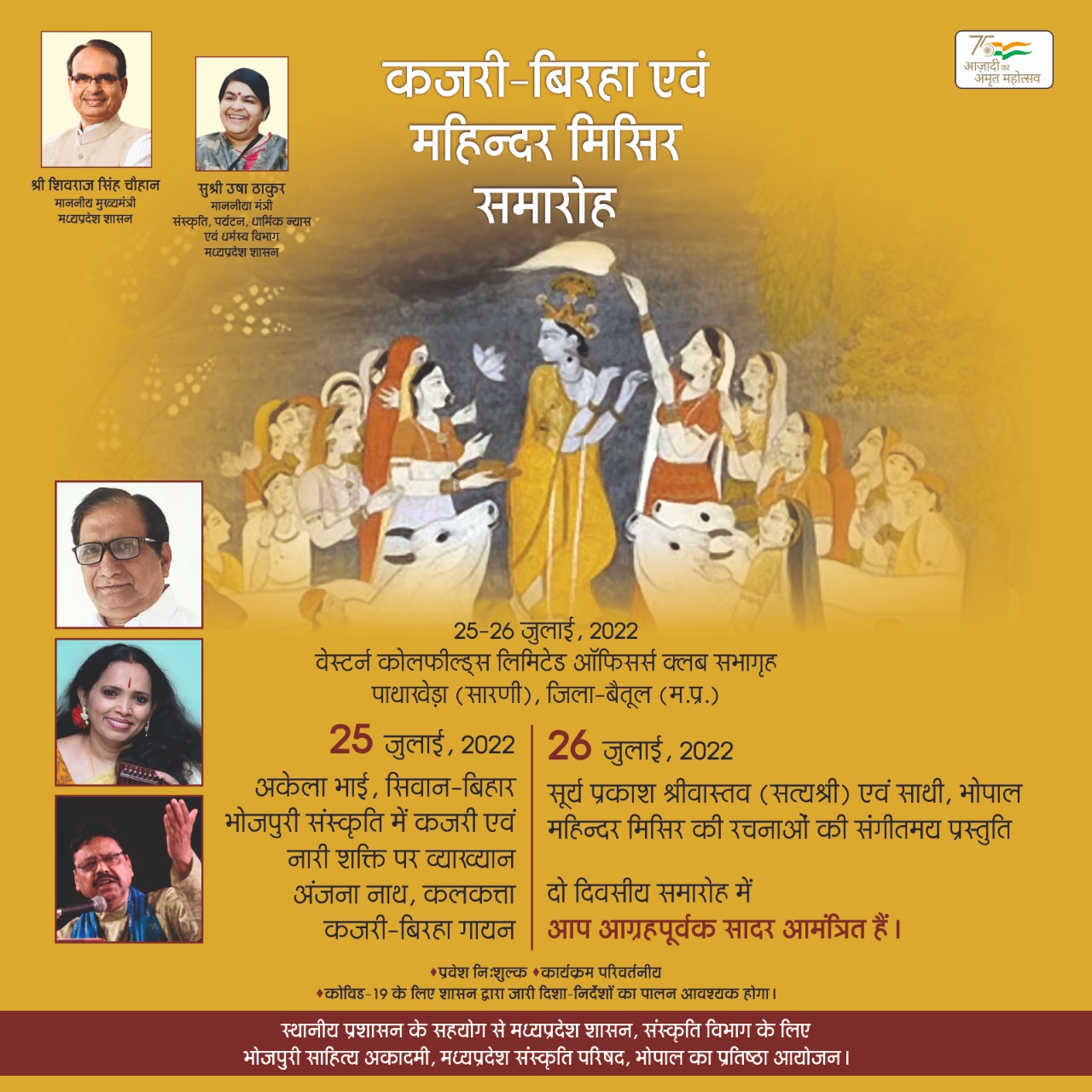 भोजपुरी साहित्य अकादमी के तत्वाधान में स्वतंत्रता के 75वें वर्षगांठ के अवसर पर ‘कजरी-बिरहा एवं महिन्दर मिसिर स्मृति समारोह‘ का दो दिवसीय आयोजन किया गया। इस दो दिवसीय समारोह में प्रथम दिवस डॉ. अकेला भाई, सिवान (बिहार) द्वारा ‘‘भोजपुरी संस्कृति में कजरी एवं नारी शक्ति‘‘ पर व्याख्यान दिया गया तथा सुश्री अंजना नाथ, कलकत्ता द्वारा ‘‘भोजपुरी पारम्परिक लोकगीत कजरी-बिरहा गायन‘‘ की प्रस्तुति दी गई। समारोह के दूसरे दिवस श्री सूर्यप्रकाश श्रीवास्तव (सत्यश्री), भोपाल एवं साथियों द्वारा ‘‘महिन्दर मिसिर की रचनाओं की संगीतमय‘‘ प्रस्तुति दी गई। वहांँ उपस्थित जनता द्वारा उक्त प्रस्तुतियों की प्रशंसा की गई।