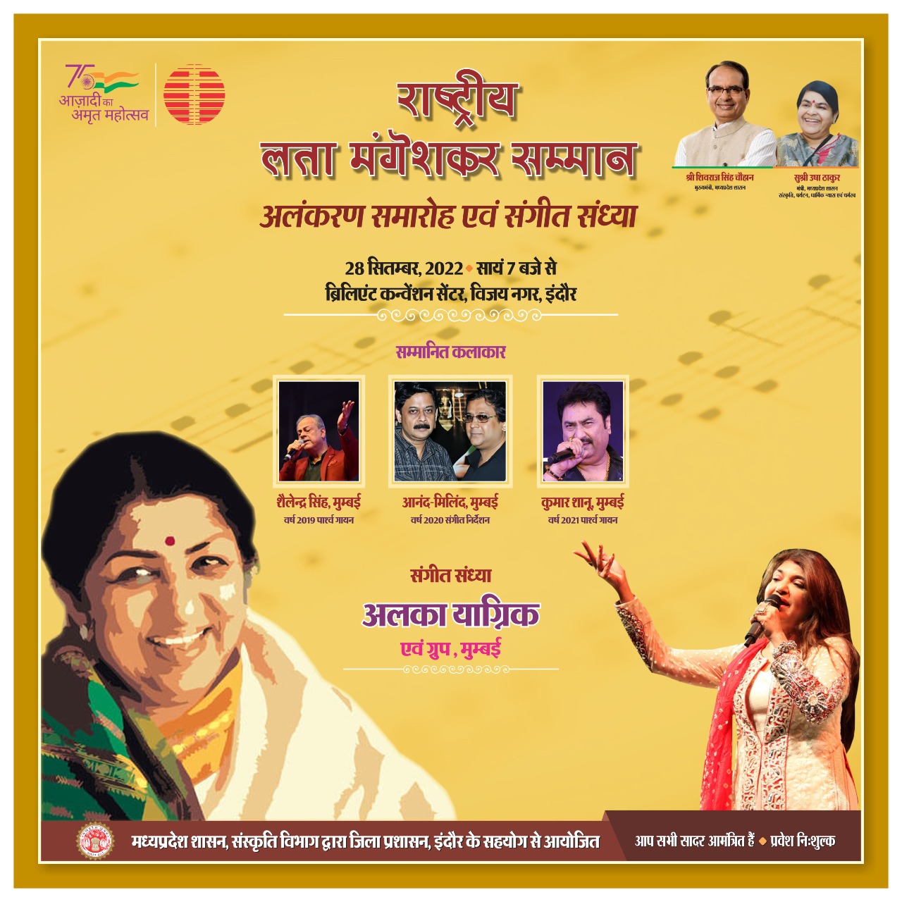 मध्यप्रदेश शासन, संस्कृति विभाग द्वारा सुगम संगीत के क्षेत्र में उत्कृष्टता, दीर्घ साधना एवं श्रेष्ठ उपलब्धि को सम्मानित करने के उद्देश्य से वर्ष 1984 से स्थापित किये गये प्रतिष्ठित राष्ट्रीय लता मंगेशकर सम्मान की घोषणा कर दी गयी है। संचालक, संस्कृति श्री अदिति कुमार त्रिपाठी ने बताया कि वर्ष 2019 का पार्श्व गायन के लिये श्री शैलेन्द्र सिंह-मुम्बई, वर्ष 2020 का संगीत निर्देशन के लिये श्री आनंद-मिलिंद, मुम्बई एवं 2021 का पार्श्व गायन के लिये श्री कुमार शानू-मुम्बई को यह सम्मान प्रदान किया जायेगा। राष्ट्रीय लता मंगेशकर सम्मान अलंकरण समारोह एवं संगीत संध्या का आयोजन मध्यप्रदेश शासन, संस्कृति विभाग द्वारा जिला प्रशासन, इंदौर के सहयोग से 28 सितम्बर, 2022 को सायं 7 बजे से ब्रिलिएंट कन्वेंशन सेंटर, विजय नगर, इंदौर में होगा। अलंकरण समारोह के पश्चात् संगीत संध्या का आयोजन किया जायेगा, जिसमें सुप्रसिद्ध गायिका सुश्री अलका याग्निक एवं ग्रुप, मुम्बई द्वारा गीतों की प्रस्तुति दी जायेगी।
