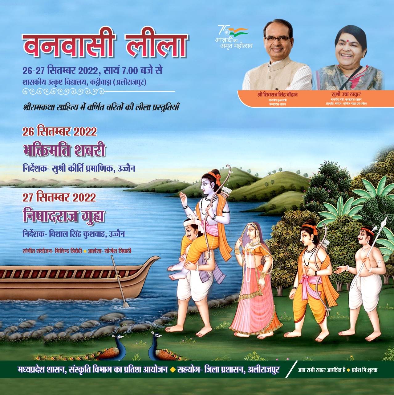 वनवासी लीला 26-27 सितम्बर 2022, सायं 7.00 बजे से शासकीय उत्कृष्ट विद्यालय, कट्ठीवाड़ा (अलीराजपुर) श्रीरामकथा साहित्य में वर्णित चरितों की लीला प्रस्तुतियाँ 26 सितम्बर 2022 भक्तिमति शबरी निर्देशक- सुश्री कीर्ति प्रमाणिक, उज्जैन 27 सितम्बर 2022 निषादराज गुद्य निर्देशक- विशाल सिंह कुशवाह, उज्जैन संगीत संयोजन- मिलिन्द त्रिवेदी आलेख- योगेश त्रिपाठी मध्यप्रदेश शासन, संस्कृति विभाग का प्रतिष्ठा आयोजन सहयोग - जिला प्रशासन, अलीराजपुर