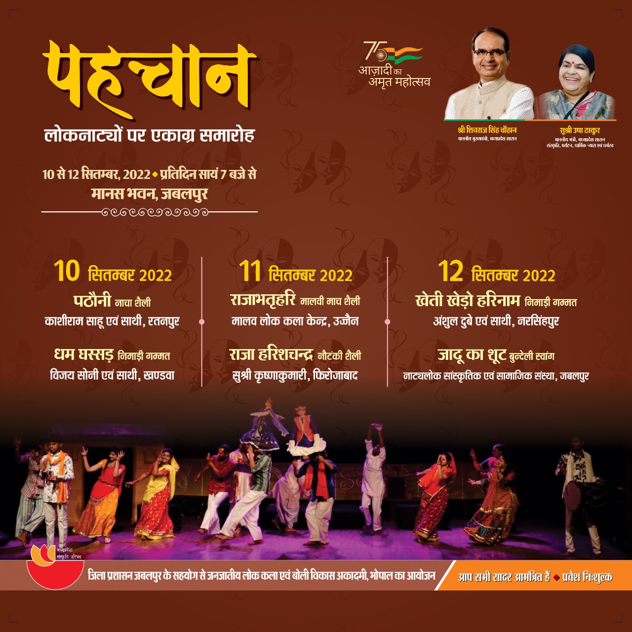 पहचान(लोकनाट्यों पर एकाग्र समारोह) 10 से 12 सितम्बर, 2022 प्रतिदिन सायं 7 बजे से मानस भवन, जबलपुर 10 सितम्बर 2022 पठौनी नाचा शैली काशीराम साहू एवं साथी, रतनपुर धम घस्सड़ निमाड़ी गम्मत विजय सोनी एवं साथी, खण्डवा 11 सितम्बर 2022 राजाभतृहरि मालवी माच शैली मालव लोक कला केन्द्र, उज्जैन राजा हरिशचन्द्र नौटंकी शैली सुश्री कृष्णाकुमारी, फिरोजाबाद 12 सितम्बर 2022 खेती खेड़ो हरिनाम निमाड़ी अंशुल दुबे एवं साथी, नरसिंहपुर जादू का शूट बुन्देली स्वांग नाट्यलोक सांस्कृतिक एवं सामाजिक संस्था, जबलपुर जिला प्रशासन जबलपुर के सहयोग से जनजातीय लोक कला एवं बोली विकास अकादमी, भोपाल का आयोजन
