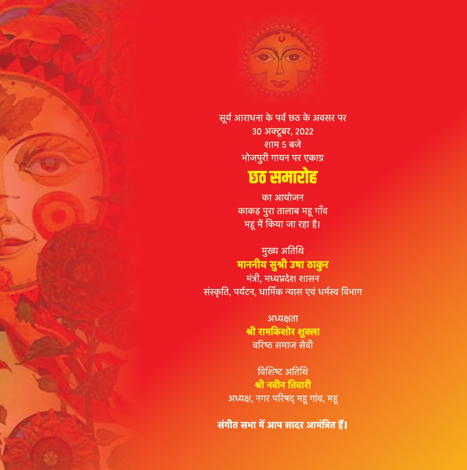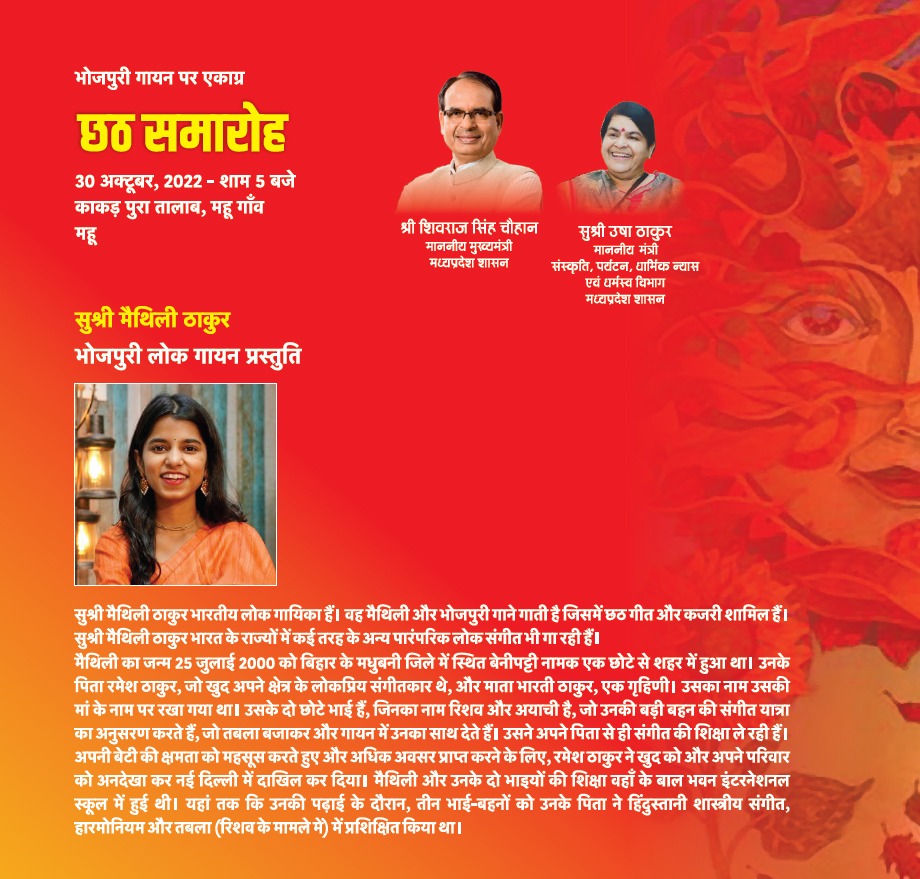 विगत वर्षानुसार इस वर्ष भी एक दिवसीय ‘‘छठ समारोह‘‘ का आयोजन कांकरपुरा तालाब किनारे, महू में किया गया। इस एक दिवसीय समारोह में सुप्रसिद्ध लोकगीत गायिका सुश्री मैथिली ठाकुर, मधुबनी, बिहार द्वारा छठ गीतों की प्रस्तुति दी गई। कार्यक्रम में उपस्थित जनसमूह द्वारा समारोह की प्रशंसा की एवं प्रस्तुतियों का आनन्द लिया गया।