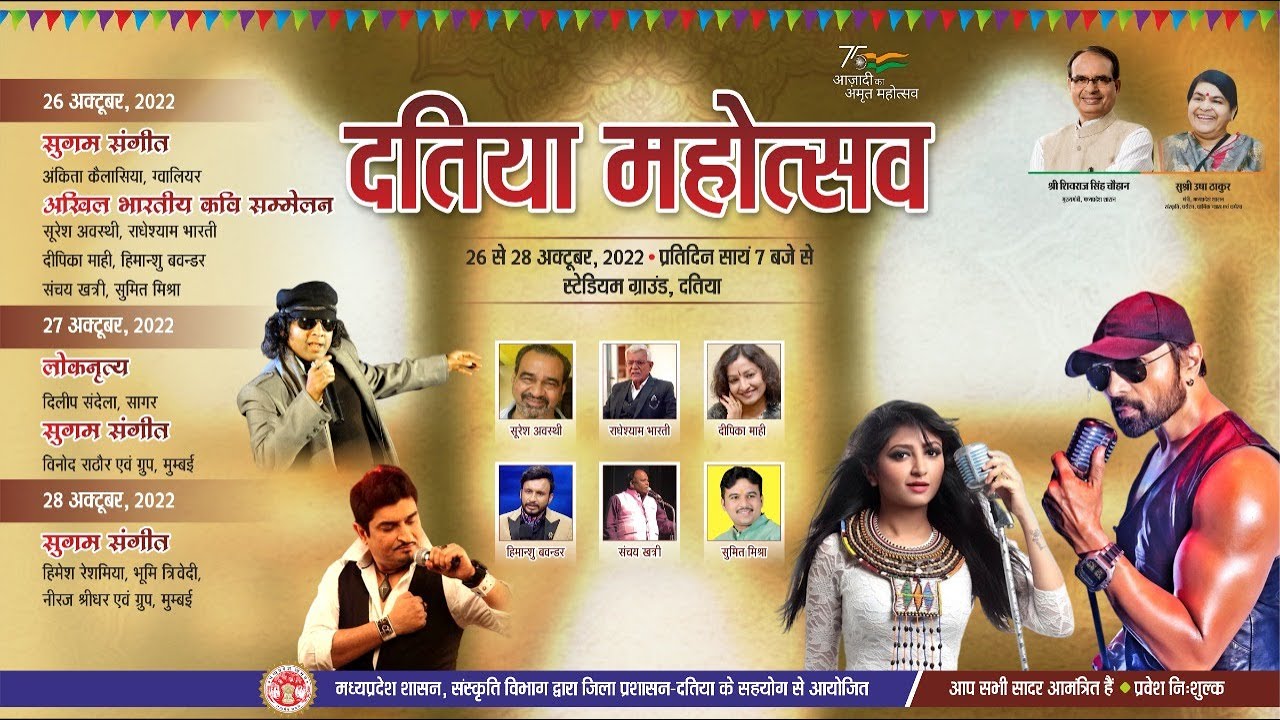दतिया महोत्सव 26 से 28 अक्टूबर, 2022 प्रतिदिन सायं 7 बजे से टेडियम ग्राउंड, दतिया मध्यप्रदेश शासन, संस्कृति विभाग द्वारा जिला प्रशासन-दतिया के सहयोग से आयोजित आप सभी सादर आमंत्रित हैं.