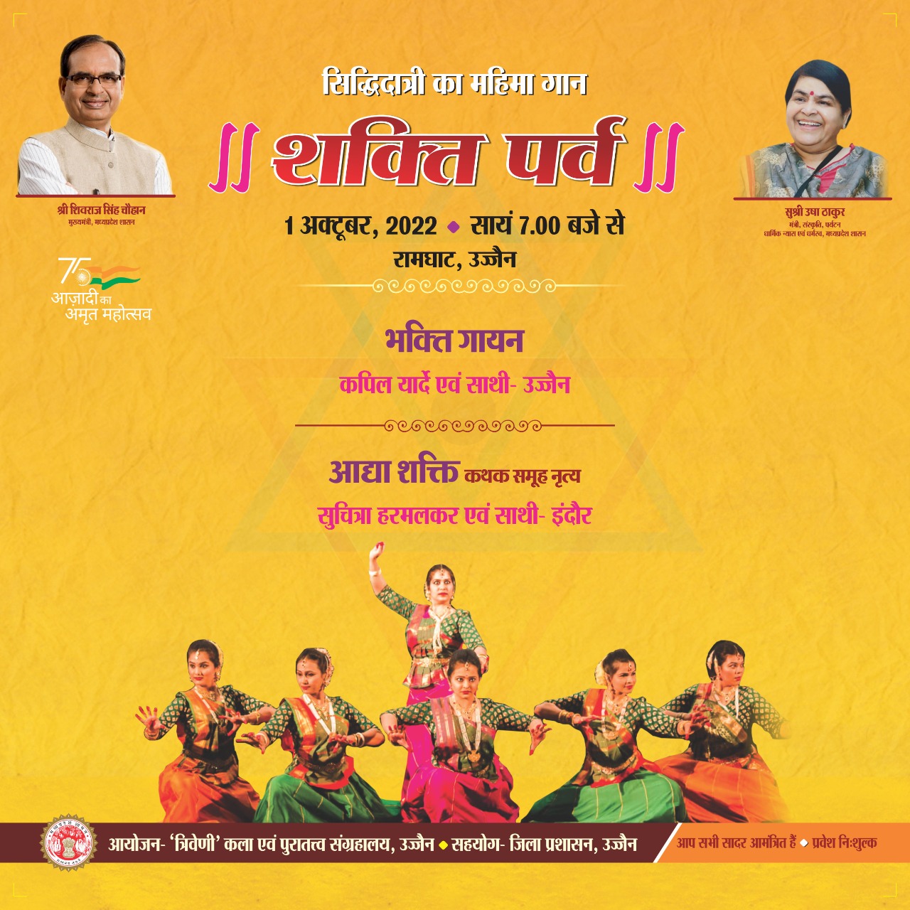 सिद्धिदात्री का महिमा गान ॥ शक्ति पर्व ॥ 1 अक्टूबर, 2022 • सायं 7.00 बजे से रामघाट, उज्जैन भक्ति गायन कपिल यादें एवं साथी- उज्जैन आद्या शक्ति कथक समूह नृत्य सुचित्रा हरमलकर एवं साथी- इंदौर आयोजन- 'त्रिवेणी' कला एवं पुरातत्त्व संग्रहालय, उज्जैन • सहयोग - जिला प्रशासन, उज्जैन
