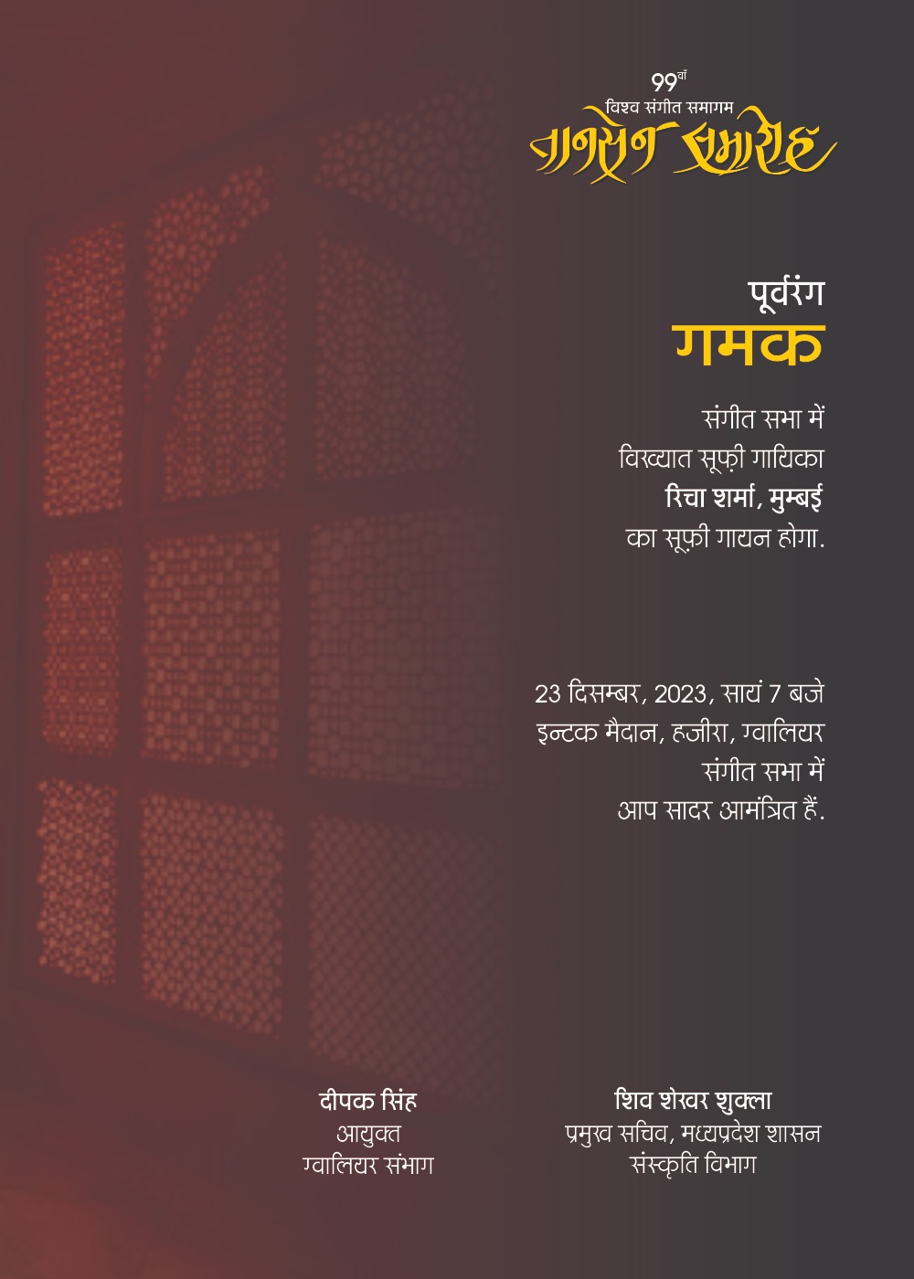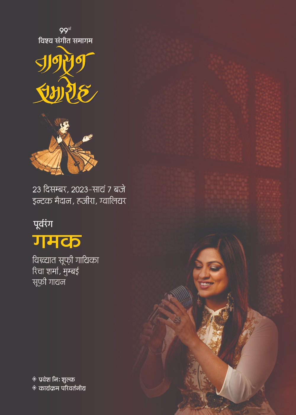 ९९वां तानसेन समारोह के अंतर्गत पूर्वरंग कार्यक्रम ''गमक'' शुरू किया गया। आज हम समारोह का ९९वां संस्करण मना रहे है। पूर्वरंग गमक तानसेन समारोह की पूर्व संध्या पर सूफी संगीत सभा का आयोजन किया जा रहा है।