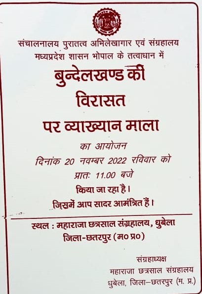 संचालनालय पुरातत्व, अभिलेखागार एवं संग्रहालय, भोपाल म.प्र. विश्व धरोहर सप्ताह के अवसर पर ‘‘ बुन्देलखण्ड की विरासत’’ पर आधारित महाराजा छत्रसाल संग्रहालय, धुबेला, छतरपुर में व्याख्यान माला का आयोजन।