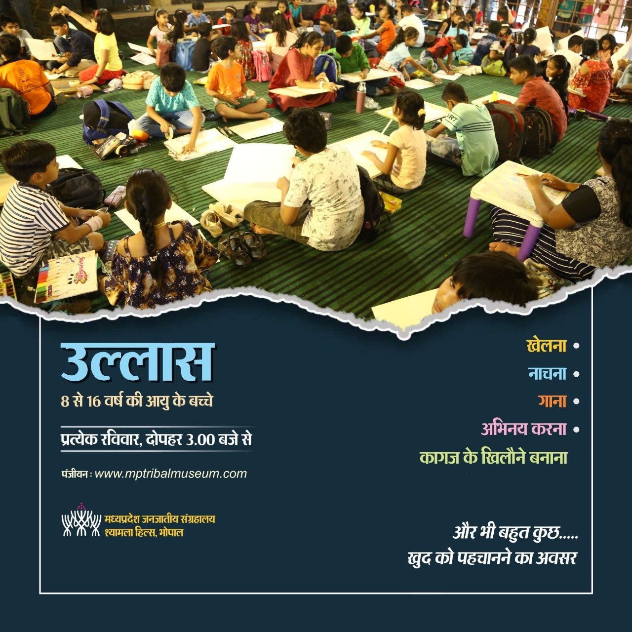 उल्लास 8 से 16 वर्ष की आयु के बच्चे नाचना ,अभिनय करना , गाना और कागज के खिलौने बनाना और भी बहुत कुछ...... खुद को पहचानने का अवसर प्रत्येक रविवार, दोपहर 3.00 बजे से पंजीयन : www.mptribalmuseum.com मध्यप्रदेश जनजातीय संग्रहालय श्यामला हिल्स, भोपाल