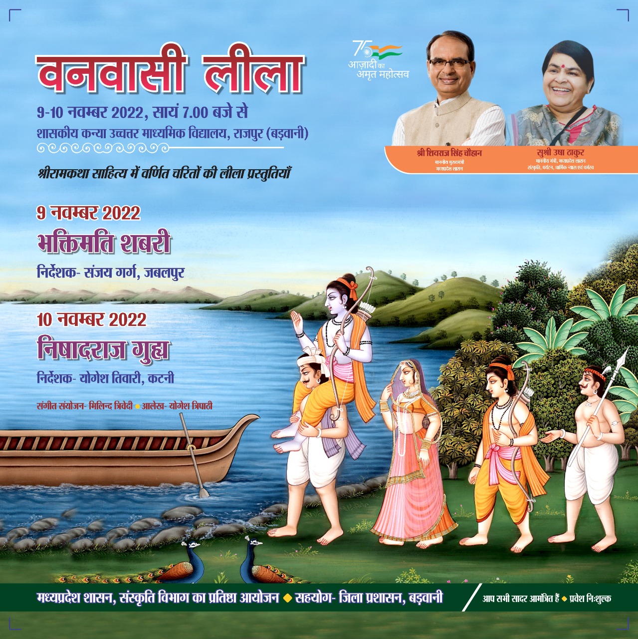 वनवासी लीला 09-10 नवम्बर 2022, सायं 7.00 बजे से शासकीय कन्या.उ.मा.वि., राजपुर (बड़वानी) श्रीरामकथा साहित्य में वर्णित चरितों की लीला प्रस्तुतियाँ 09 नवम्बर 2022 भक्तिमति शबरी निर्देशक- संजय गर्ग-जबलपुर 10 नवम्बर 2022 निषादराज गुद्य निर्देशक- योगेश तिवारी-कटनी संगीत संयोजन- मिलिन्द त्रिवेदी आलेख- योगेश त्रिपाठी मध्यप्रदेश शासन, संस्कृति विभाग का प्रतिष्ठा आयोजन सहयोग - जिला प्रशासन,राजपुर (बड़वानी)