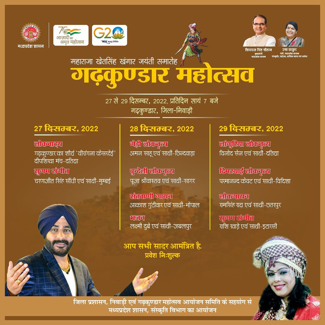 महाराजा खेतसिंह खंगार की जयंती अवसर पर मध्यप्रदेश शासन, संस्कृति विभाग द्वारा जिला प्रशासन, निवाड़ी एवं गढ़कुंडार महोत्सव आयोजन समिति के सहयोग से तीन दिवसीय ‘गढ़कुंडार महोत्सव’ का आयोजन 27 से 29 दिसम्बर, 2022 तक गढ़कुंडार में किया जावेगा। संचालक संस्कृति श्री अदिति कुमार त्रिपाठी ने बताया कि इस प्रतिष्ठित आयोजन में तीनों दिवस देश भर के सुप्रसिद्ध कलाकार अपनी प्रस्तुतियां देंगे।. दिनांक - 27 से 29 दिसम्बर, 2022 प्रतिदिन सायं 7 बजे गढ़कुण्डार, जिला-निवाड़ी