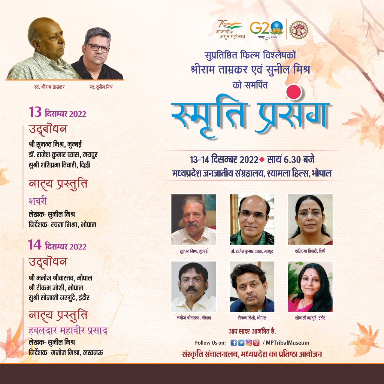 सुप्रतिष्ठित फिल्म विश्लेषकों श्रीराम ताम्रकर एवं सुनील मिश्र को समर्पित स्मृति प्रसंग दिनांक : 13-14 दिसम्बर 2022 शाम 6:30 बजे मध्यप्रदेश जनजातीय संग्रहालय, श्यामला हिल्स, भोपाल आप सादर आमंत्रित है. संस्कृति संचालनालय, मध्यप्रदेश का प्रतिष्ठा आयोजन