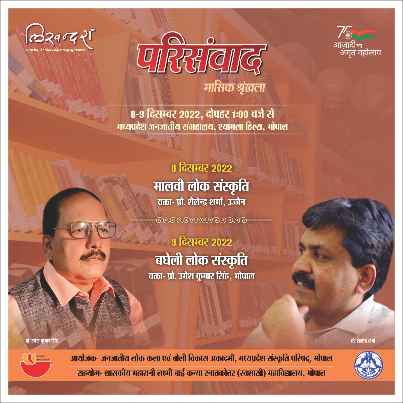 परिसंवाद (मासिक श्रृंखला) 8-9 दिसम्बर 2022, दोपहर 1:00 बजे से मध्यप्रदेश जनजातीय संग्रहालय, श्यामला हिल्स, भोपाल 8 दिसम्बर 2022 मालवी लोक संस्कृति वक्ता -प्रो. शैलेन्द्र शर्मा, उज्जैन 9 दिसम्बर 2022 बघेली लोक संस्कृति वक्ता प्रो. उमेश कुमार सिंह, भोपाल आयोजक - जनजातीय लोक कला एवं बोली विकास अकादमी, मध्यप्रदेश संस्कृति परिषद्, भोपाल सहयोग- शासकीय महारानी लक्ष्मी बाई कन्या स्नातकोत्तर (स्वशासी) महाविद्यालय, भोपाल