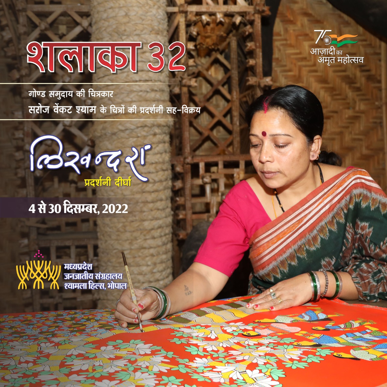 शलाका 32 गोण्ड समुदाय की चित्रकार सरोज वेंकट श्याम के चित्रों की प्रदर्शनी सह - विक्रय लिखन्दरा प्रदर्शनी दीर्घा 4 से 30 दिसम्बर, 2022 मध्यप्रदेश जनजातीय संग्रहालय हिल्स, भोपाल
