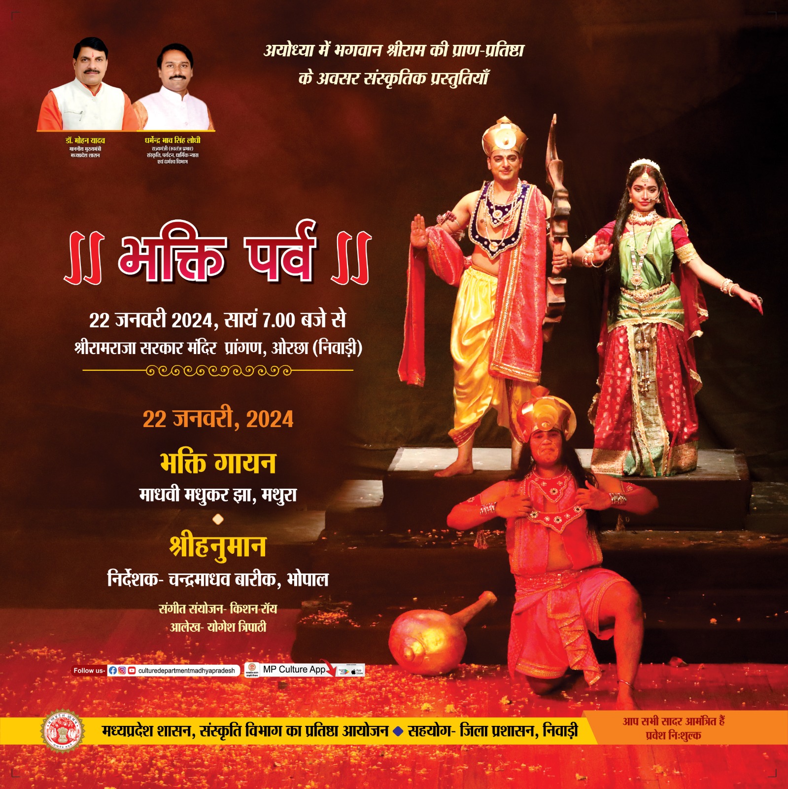 ॥ श्रीरामचरित लीला ॥ समारोह 22 जनवरी 2024, सायं 7.00 बजे से श्रीरामराजा सरकार मंदिर प्रांगण, ओरछा (निवाड़ी) मध्यप्रदेश शासन, संस्कृति विभाग का प्रतिष्ठा आयोजन सहयोग- जिला प्रशासन, (निवाड़ी)