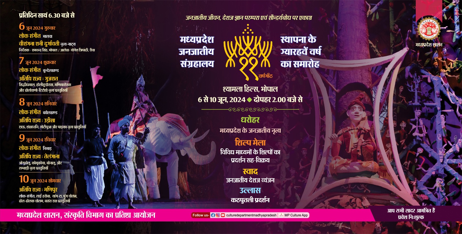 जनजातीय जीवन, देशज ज्ञान परम्परा एवं सौन्दर्यबोध पर एकाग्र मध्यप्रदेश जनजातीय संग्रहालय स्थापना के ग्यारहवें वर्ष का समारोह श्यामला हिल्स, भोपाल 6 से 10 जून, 2024 दोपहर 2.00 बजे से धरोहर,मध्यप्रदेश के जनजातीय नृत्य,शिल्प मेला,विविध माध्यमों के शिल्पों का प्रदर्शन सह-विक्रय,स्वाद जनजातीय देशज व्यंजन उल्लास कठपुतली प्रदर्शन मध्यप्रदेश शासन, संस्कृति विभाग का प्रतिष्ठा आयोजन