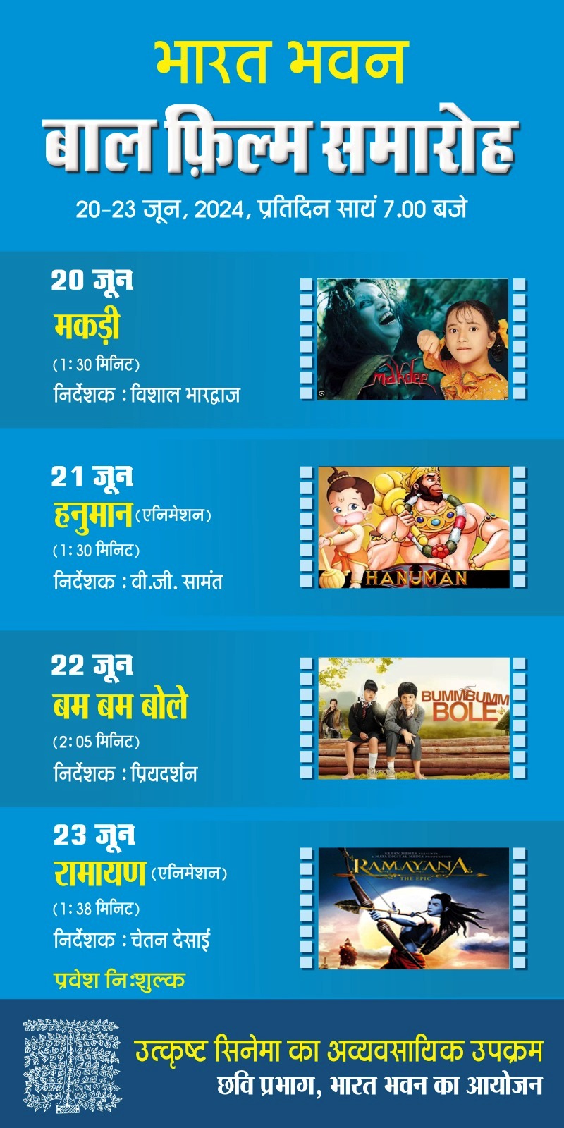 भारत भवन बाल फ़िल्म समारोह 20-23 जून, 2024, प्रतिदिन सायं 7.00 बजे 20 जून मकड़ी निर्देशक : विशाल भारद्वाज 21 जून हनुमान (एनिमेशन) निर्देशक : वी. जी. सामंत 22 जून बम बम बोले निर्देशक : प्रियदर्शन 23 जून रामायण (एनिमेशन) निर्देशक : चेतन देसाई प्रवेश निःशुल्क