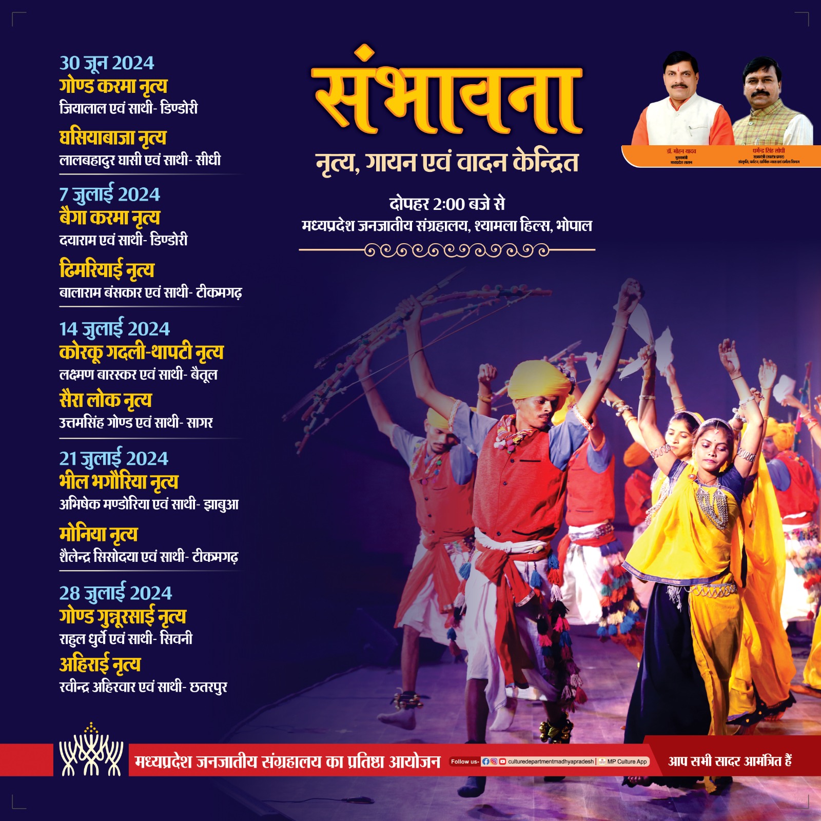 संभावना नृत्य, गायन एवं वादन केन्द्रित दोपहर 2:00 बजे से मध्यप्रदेश जनजातीय संग्रहालय, श्यामला हिल्स, भोपाल मध्यप्रदेश जनजातीय संग्रहालय का प्रतिष्ठा आयोजन