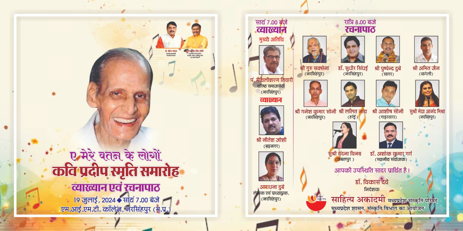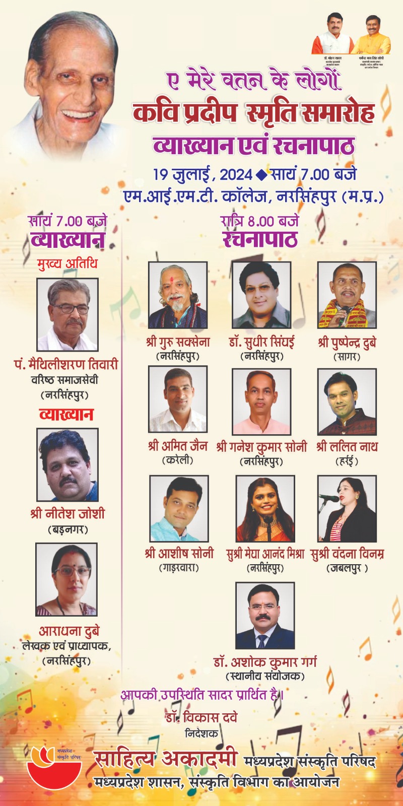 साहित्य अकादमी, मध्यप्रदेश संस्कृति परिषद्, मध्यप्रदेश शासन संस्कृति विभाग भोपाल द्वारा कवि प्रदीप स्मृति समारोह में ‘व्याख्यान एवं रचनापाठ’ दिनांक 19 जुलाई, 2024 को सायं 7.00 बजे एम.आई.एम.टी. कॉलेज, नरसिंहपुर (म.प्र.) में आयोजित है। प्रथम सत्र के मुख्य अतिथि पं. मैथिलीशरण तिवारी एवं श्री नीतेश जोशी तथा सुश्री आराधना दुबे व्याख्यान देंगे। कार्यक्रम के दूसरे सत्र में गुरु सक्सेना-नरसिंहपुर, डॉ. सुधीर सिंघई-नरसिंहपुर, पुष्पेन्द्र दुबे-सागर, अमित जैन-करेली, गनेश कुमार सोनी-नरसिंहपुर, ललित नाथ-हर्रई, आशीष सोनी-गाड़रवारा, सुश्री मेघा आनंद मिश्रा-नरसिंहपुर एवं सुश्री वंदना सोनी-जबलपुर अपनी-अपनी रचनाओं का पाठ करेंगे। आयोजित व्याख्यान एवं रचनापाठ में आप सभी सादर साग्रह आमंत्रित हैं। डॉ. विकास दवे निदेशक साहित्य आदमी, भोपाल
