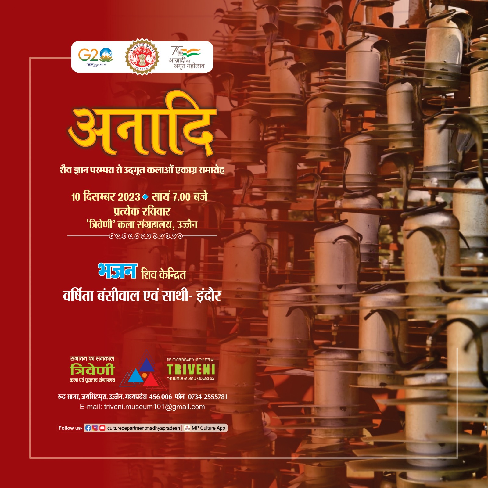 त्रिवेणी कला एवं पुरातत्व संग्रहालय, उज्जैन में शैव ज्ञान परंपरा से उद्भूत कलाओं पर एकाग्र साप्ताहिक श्रंखला "अनादि" का आयोजन प्रत्येक रविवार को किया जा रहा है । इसी क्रम में आगामि 10 दिसम्बर 2023 को सुश्री वर्षिता बंसीवाल एवं साथी, इंदौर के कलाकारों द्वारा शिव केन्द्रित भक्ति गानय की प्रस्तुति संग्रहालय परिसर में सायं 07 बजे से आयोजित होगी ।