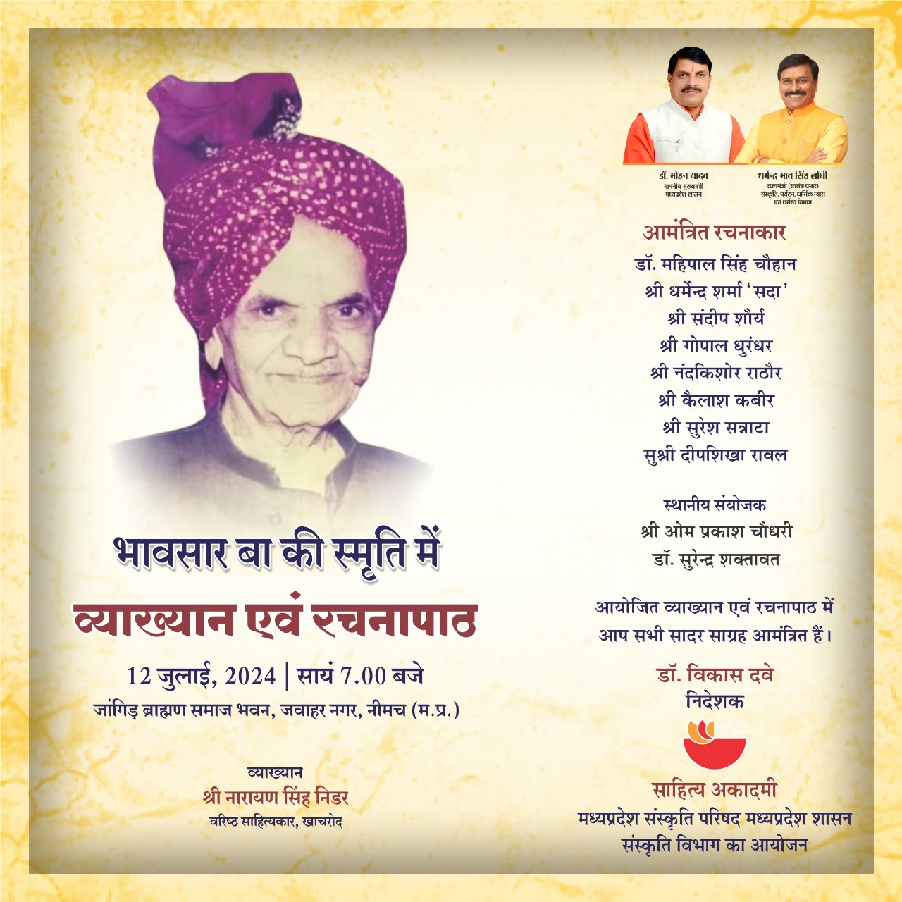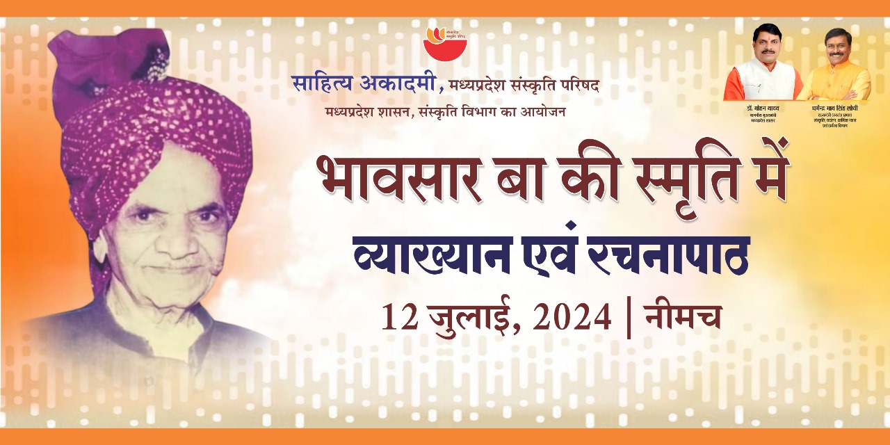 साहित्य अकादमी, मध्यप्रदेश संस्कृति परिषद्, मध्यप्रदेश शासन संस्कृति विभाग भोपाल द्वारा भावसार बा स्मृति समारोह में ‘व्याख्यान एवं रचनापाठ’ दिनांक 12 जुलाई, 2024 को सायं 7.00 बजे से जांगिड़ ब्राम्हण समाज भवन, जवाहर नगर, नीमच (म.प्र.) में आयोजित है। प्रथम सत्र श्री नारायण सिंह निडर अपना व्याख्यान देंगे। कार्यक्रम के दूसरे सत्र में डॉ. महिपाल सिंह चैहान, श्री धर्मेन्द्र शर्मा ‘सदा’, श्री संदीप शौर्य, श्री गोपाल धुरंधर, श्री नंदकिशोर राठौर, श्री कैलाश कबीर, श्री सुरेश सन्नाटा एवं सुश्री दीपशिखा रावल अपनी-अपनी रचनाओं का पाठ करेंगे। आयोजित व्याख्यान एवं रचनापाठ में आप सभी सादर साग्रह आमंत्रित हैं। डॉ. विकास दवे निदेशक साहित्य आदमी, भोपाल