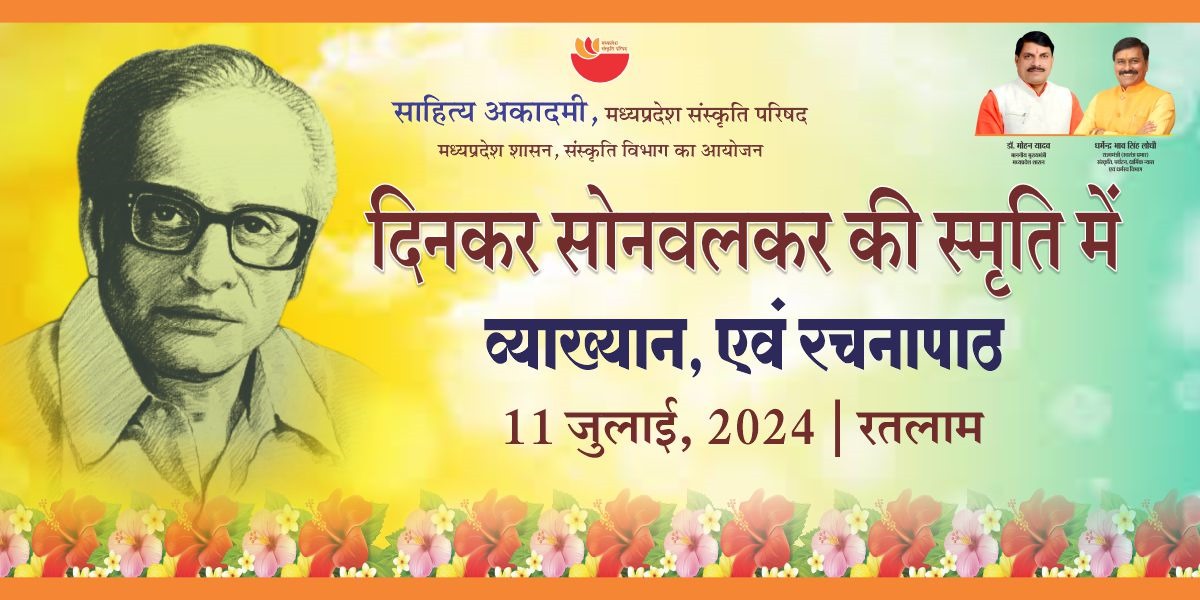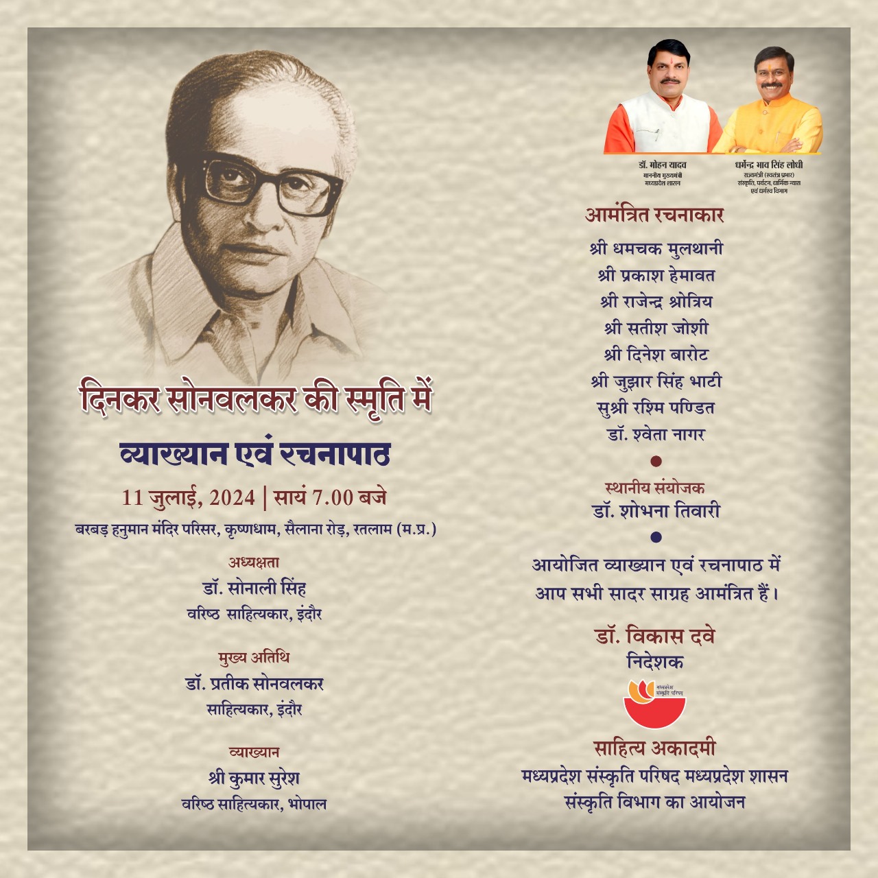 साहित्य अकादमी, मध्यप्रदेश संस्कृति परिषद्, मध्यप्रदेश शासन संस्कृति विभाग भोपाल द्वारा दिनकर सोनवलकर स्मृति समारोह में ‘व्याख्यान एवं रचनापाठ’ दिनांक 11 जुलाई, 2024 को सायं 7.00 बजे से बरबड़ हनुमान मंदिर परिसर, कृष्णधाम, सैलाना रोड, रतलाम (म.प्र.) में आयोजित है। प्रथम सत्र की अध्यक्षता डॉ. सोनाली सिंह-इंदौर करेंगी। मुख्य अतिथि डॉ. प्रतीक सोनवलकर-इंदौर एवं श्री कुमार सुरेश-भोपाल अपना व्याख्यान देंगे। कार्यक्रम के दूसरे सत्र में श्री धमचक मुलथानी, श्री प्रकाश हेमावत, श्री राजेन्द्र श्रोत्रिय, श्री सतीश जोशी, श्री दिनेश बारोट, श्री जुझार सिंह भाटी, सुश्री रश्मि पण्डित एवं डॉ. श्वेता नागर अपनी-अपनी रचनाओं का पाठ करेंगे। आयोजित व्याख्यान एवं रचनापाठ में आप सभी सादर साग्रह आमंत्रित हैं। डॉ. विकास दवे निदेशक साहित्य आदमी, भोपाल