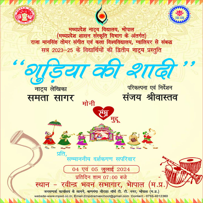 मध्यप्रदेश नाट्य विद्यालय, भोपाल एवं राजा मानसिंह तोमर संगीत एवं कला विश्वविद्यालय से संबद्ध वर्तमान सत्र 2023-25 के विद्यार्थियों के साथ आमंत्रित अतिथि व्याख्याता श्री संजय श्रीवास्तव के निर्देशन में लोक नाट्य शैली पर आधारित नाट्य प्रस्तुति '' गुडिया की शादी '' तैयार की गई है।