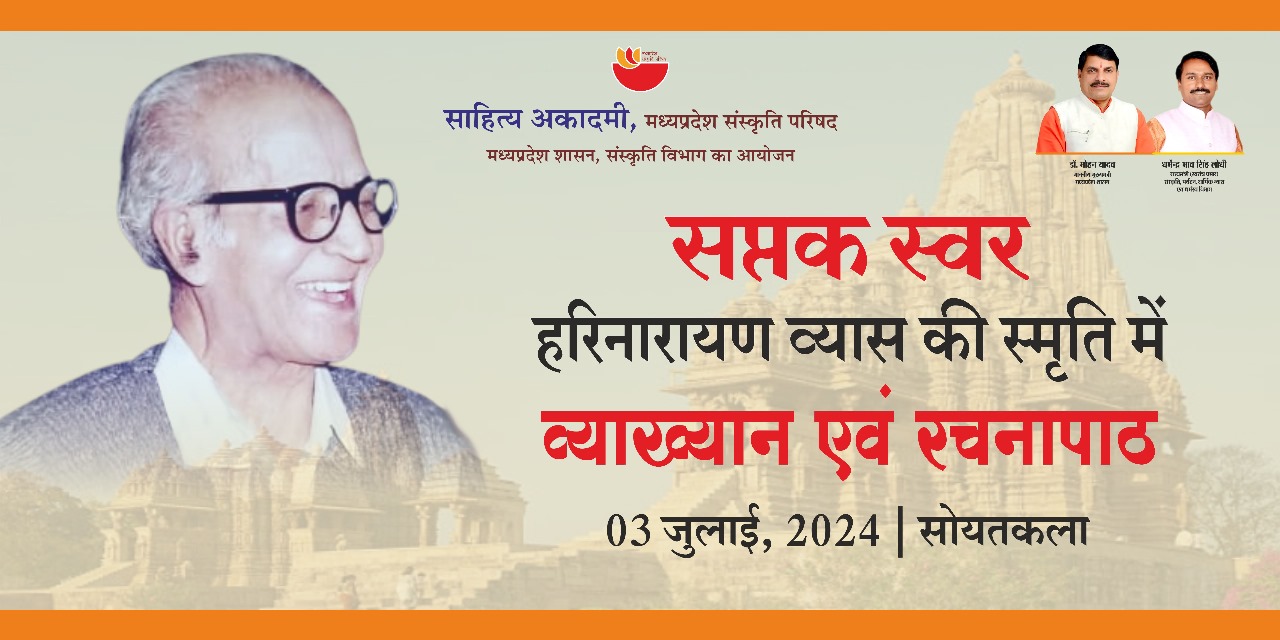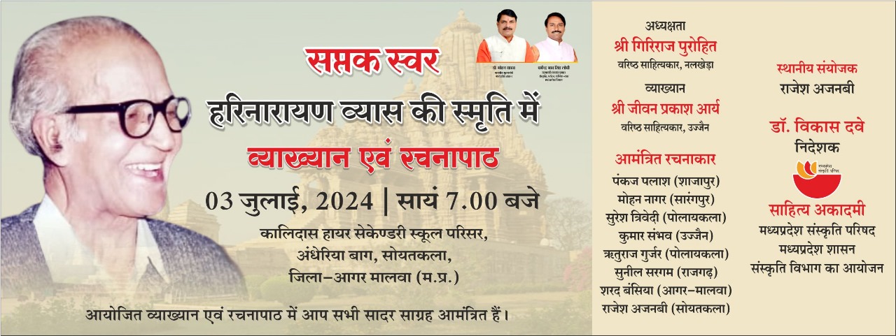 साहित्य अकादमी, मध्यप्रदेश संस्कृति परिषद्, मध्यप्रदेश शासन संस्कृति विभाग भोपाल द्वारा हरिनारायण व्यास स्मृति समारोह में ‘व्याख्यान एवं रचनापाठ’ दिनांक 3 जुलाई, 2024 को सायं 7.00 बजे सोयतकला, जिला-आगर मालवा (म.प्र.) में आयोजित है। दिनांक 3 जुलाई, 2024 की सायं 7.00 बजे प्रथम सत्र में श्री गिरिराज पुरोहित-नलखेड़ा की अध्यक्षता में श्री जीवन प्रकाश आर्य-उज्जैन व्यख्यान देंगे। कार्यक्रम के दूसरे सत्र में पंकज पलाश-शाजापुर, मोहन नागर-सारंगपुर, सुरेश त्रिवेदी-पोलायकला, कुमार संभव-उज्जैन, ऋतुराज गुर्जर-पोलायकला, सुनील सरगम-राजगढ़, शरद बंसिया-आगर मालवा एवं राजेश अजनबी-सोयतकला अपनी-अपनी रचनाओं का पाठ करेंगे। आयोजित व्याख्यान एवं रचनापाठ में आप सभी सादर साग्रह आमंत्रित हैं। डॉ. विकास दवे निदेशक साहित्य आदमी, भोपाल