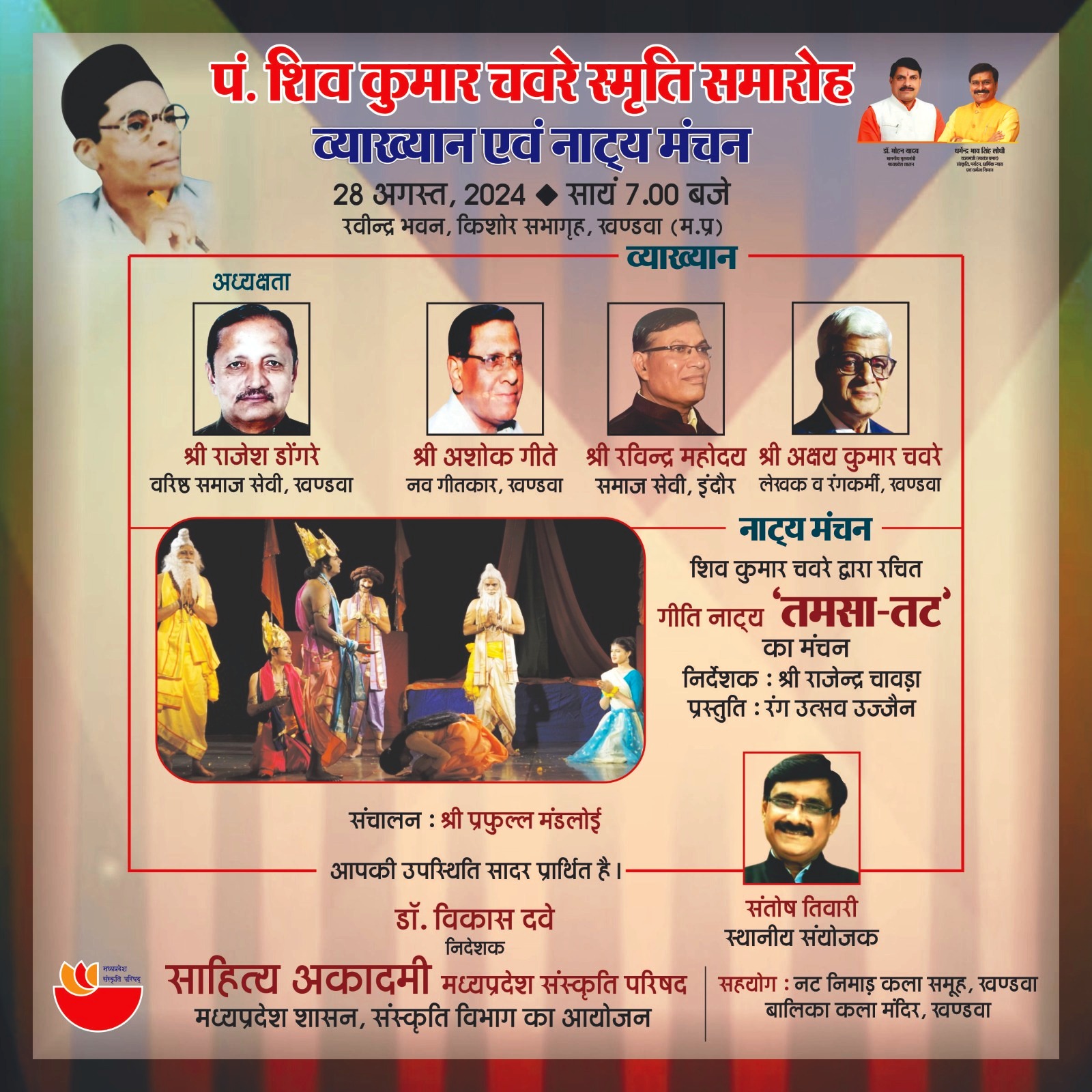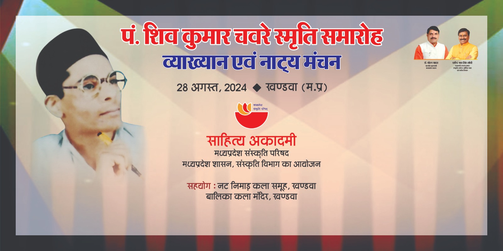 साहित्य अकादमी, मध्यप्रदेश संस्कृति परिषद्, मध्यप्रदेश शासन संस्कृति विभाग भोपाल द्वारा पं. शिव कुमार चवरे स्मृति समारोह में ‘व्याख्यान एवं नाटय मंचन’ दिनांक 28 अगस्त, 2024 को सायं 7.00 बजे रवीन्द्र भवन, किशोर सभागृह, खण्डवा (म.प्र.) में आयोजित है। प्रथम सत्र की अध्यक्षता वरिष्ठ समाज सेवी श्री राजेश डोंगरे-खण्डवा करेंगे। श्री अशोक गीते-खण्डवा, श्री रविन्द्र महोदय-इंदौर एवं श्री अक्षय कुमार चवरे-खण्डवा व्याख्यान देंगे। कार्यक्रम के दूसरे सत्र में श्री शिव कुमार चवरे द्वारा रचित गीति नाट्य ‘तमसा-तट’ का मंचन श्री राजेन्द्र चावड़ा-उज्जैन के निर्देशन में रंग उत्सव उज्जैन संस्था द्वारा किया जाएगा। कार्यक्रम के स्थानीय संयोजक संतोष तिवारी होंगे। आयोजित व्याख्यान एवं नाट्य मंचन में आप सभी सादर साग्रह आमंत्रित हैं। डॉ. विकास दवे निदेशक-साहित्य अकादमी, भोपाल
