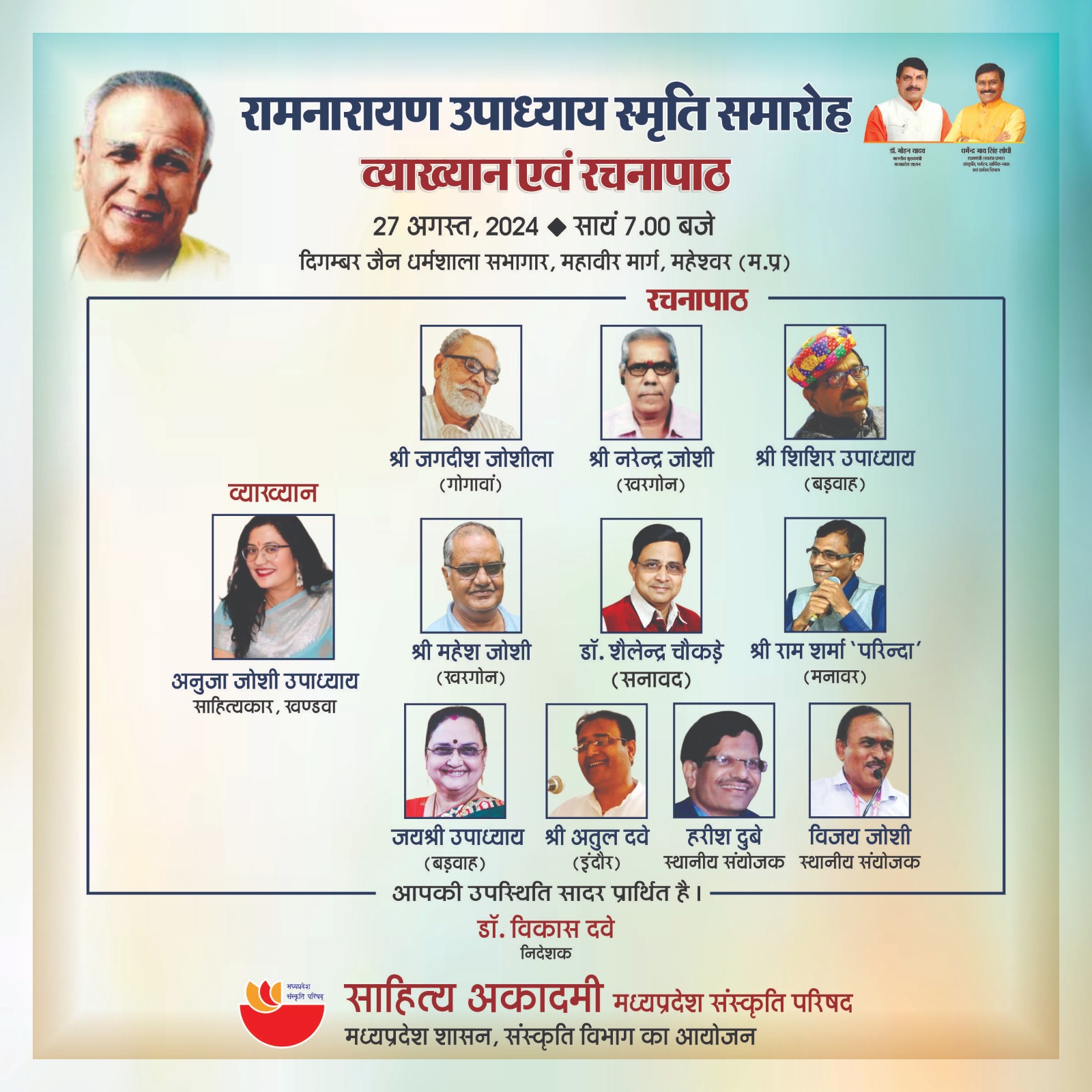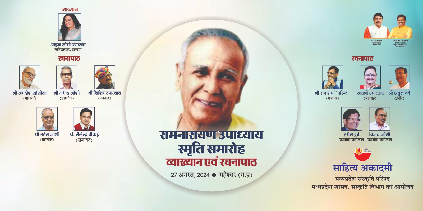 साहित्य अकादमी, मध्यप्रदेश संस्कृति परिषद्, मध्यप्रदेश शासन संस्कृति विभाग भोपाल द्वारा रामनारायण उपाध्याय स्मृति समारोह में ‘व्याख्यान एवं रचनापाठ’ दिनांक 27 अगस्त, 2024 को सायं 7.00 बजे दिगम्बर जैन धर्मशाला सभागार, महावीर मार्ग, महेश्वर (म.प्र.) में आयोजित है। प्रथम सत्र श्रीमती अनुजा जोशी उपाध्याय-खण्डवा व्याख्यान देंगी। कार्यक्रम के दूसरे सत्र में श्री जगदीश जोशीला-गोगावां, श्री नरेन्द्र जोशी-खरगोन, श्री शिशिर उपाध्याय-बड़वाह, श्री महेश जोशी-खरगोन, डॉ. शैलेन्द्र चैकड़े-सनावद, श्री राम शर्मा ‘परिन्दा’-मनावर, श्रीमती जयश्री उपाध्याय-बड़वाह एवं श्री अतुल दवे-इंदौर अपनी-अपनी रचनाओं का पाठ करेंगे। कार्यक्रम के स्थानीय संयोजक हरीश दुबे-विजय जोशी होंगे। आयोजित व्याख्यान एवं रचनापाठ में आप सभी सादर साग्रह आमंत्रित हैं। डॉ. विकास दवे निदेशक-साहित्य अकादमी, भोपाल