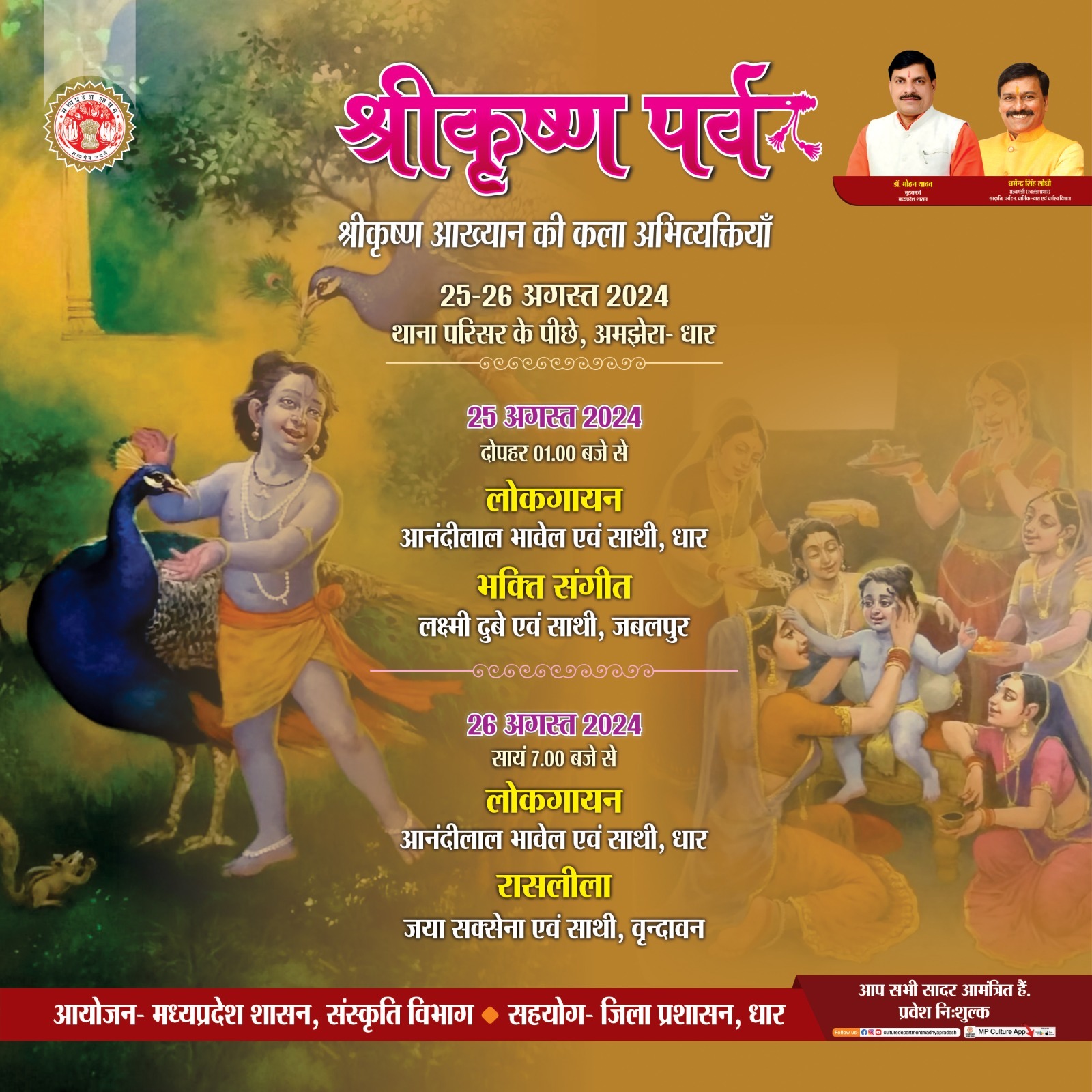 अमझेरा (धार) में 25 एवं 26 अगस्त, 2024 को श्रीकृष्ण पर्व का आयोजन किया जावेगा। यहां पहले दिन 25 अगस्त को सुश्री लक्ष्मी दुबे एवं साथी, जबलपुर द्वारा भक्ति संगीत एवं श्री आनंदीलाल भावेल एवं साथी, धार द्वारा भक्ति संगीत की प्रस्तुति दोपहर 12 बजे दी जावेगी। 26 अगस्त को सायं 7 बजे से श्री आनंदीलाल भावेल, धार द्वारा भक्ति संगीत एवं सुश्री जया सक्सेना एवं साथी, वृन्दावन द्वारा रासलीला की प्रस्तुति दी जावेगी।