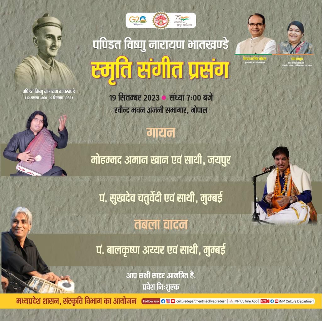 "मध्यप्रदेश शासन, संस्कृति विभाग की ओर से 19 सितंबर, 2023 को सायं 7 बजे भोपाल स्थित रवीन्द्र भवन के अंजनी सभागार में पंडित विष्णु नारायण भातखंडे स्मृति संगीत प्रसंग का आयोजन किया जाएगा। इसमें देश के विख्यात कलाकार गायन एवं संगीत का रंगारंग कार्यक्रम प्रस्तुत करेंगे। इस भव्य आयोजन में आप सादर आमंत्रित हैं तथा इसमें प्रवेश निःशुल्क है।"