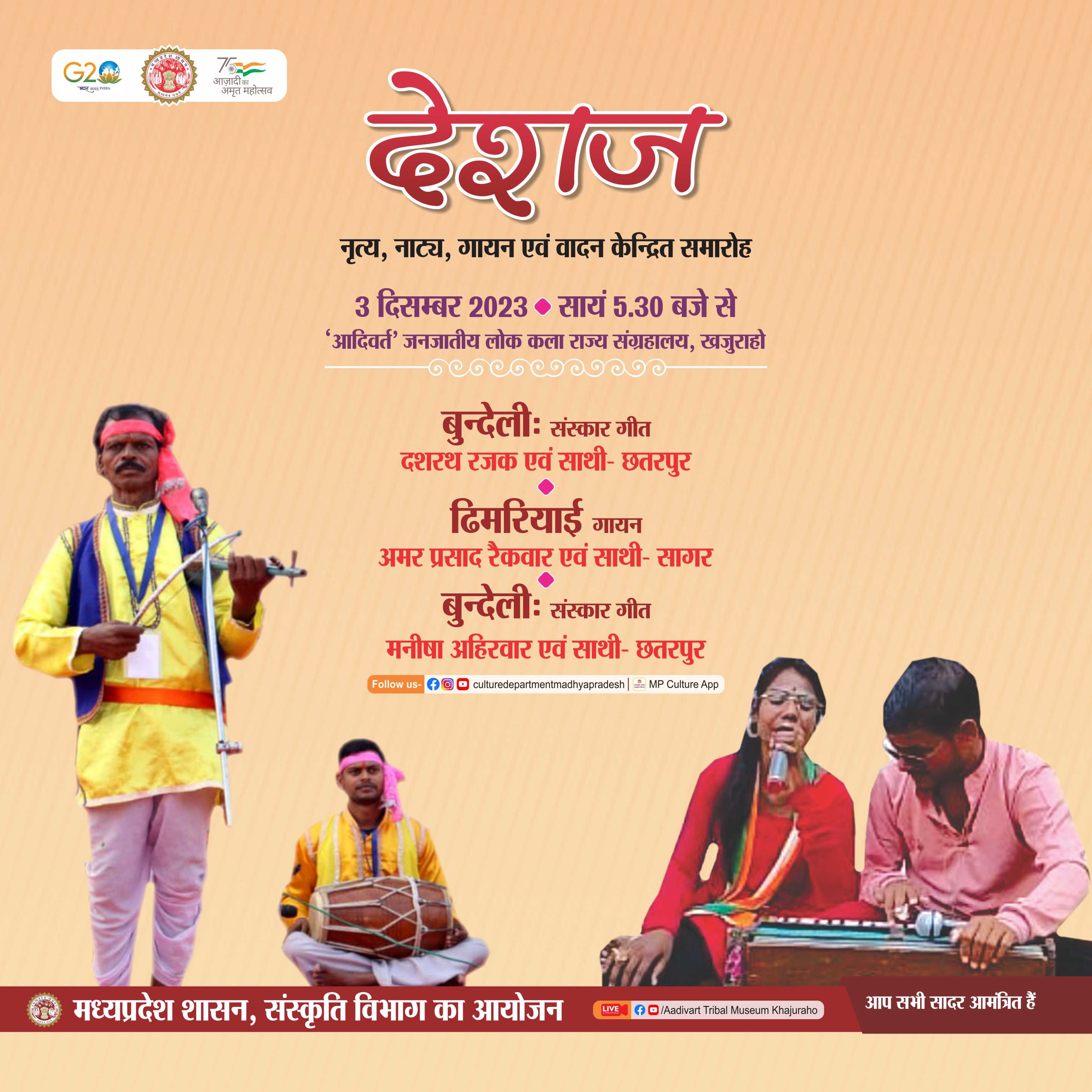II देशज II1. श्री दषरथ रजक, छतरपुर 03 दिसम्बर 2023 बुन्देली संस्कार गीत 2. श्री अमर प्रसाद रैकवार, सागर 03 दिसम्बर 2023 ढिमरियाई नृत्य 3. सुश्री मनीषा अहिरवार, बिजावर 03 दिसम्बर 2023 बुन्देली संस्कार गीत 4. श्री राजेन्द्र सिंह निरंजन, ललितपुर 10 दिसम्बर 2023 बुन्देली संस्कार गीत 5. श्री मौजीलाल भारती, छिंदवाड़ा 10 दिसम्बर 2023 भड़म नृत्य 6. श्री छोटेलाल यादव, बक्सहवा छतरपुर 10 दिसम्बर 2023 बुन्देली राई गीत 7. श्री धनीराम रैकवार, बिजावर 17 दिसम्बर 2023 देवी भजन 8. श्री लक्ष्मीनारायण, हरदा 17 दिसम्बर 2023 काठी नृत्य 9. सुश्री विनीता कुषवाहा, नौगांव 17 दिसम्बर 2023 बुन्देली संस्कार गीत 10. सुश्री राजकुमारी अहिरवार, खजुराहो 24 दिसम्बर 2023 देवी भजन 11. सुश्री रजनी बाई, डिण्डोरी 24 दिसम्बर 2023 सैला / करमा 12. सुश्री कमला लोधी, छतरपुर 24 दिसम्बर 2023 देवी भजन Like and follow us - https://www.facebook.com/aadivartmuseumkhajuraho/ https://twitter.com/adivartmuseum https://www.instagram.com/adivartmuseum/ https://www.aadivartmuseum.in/