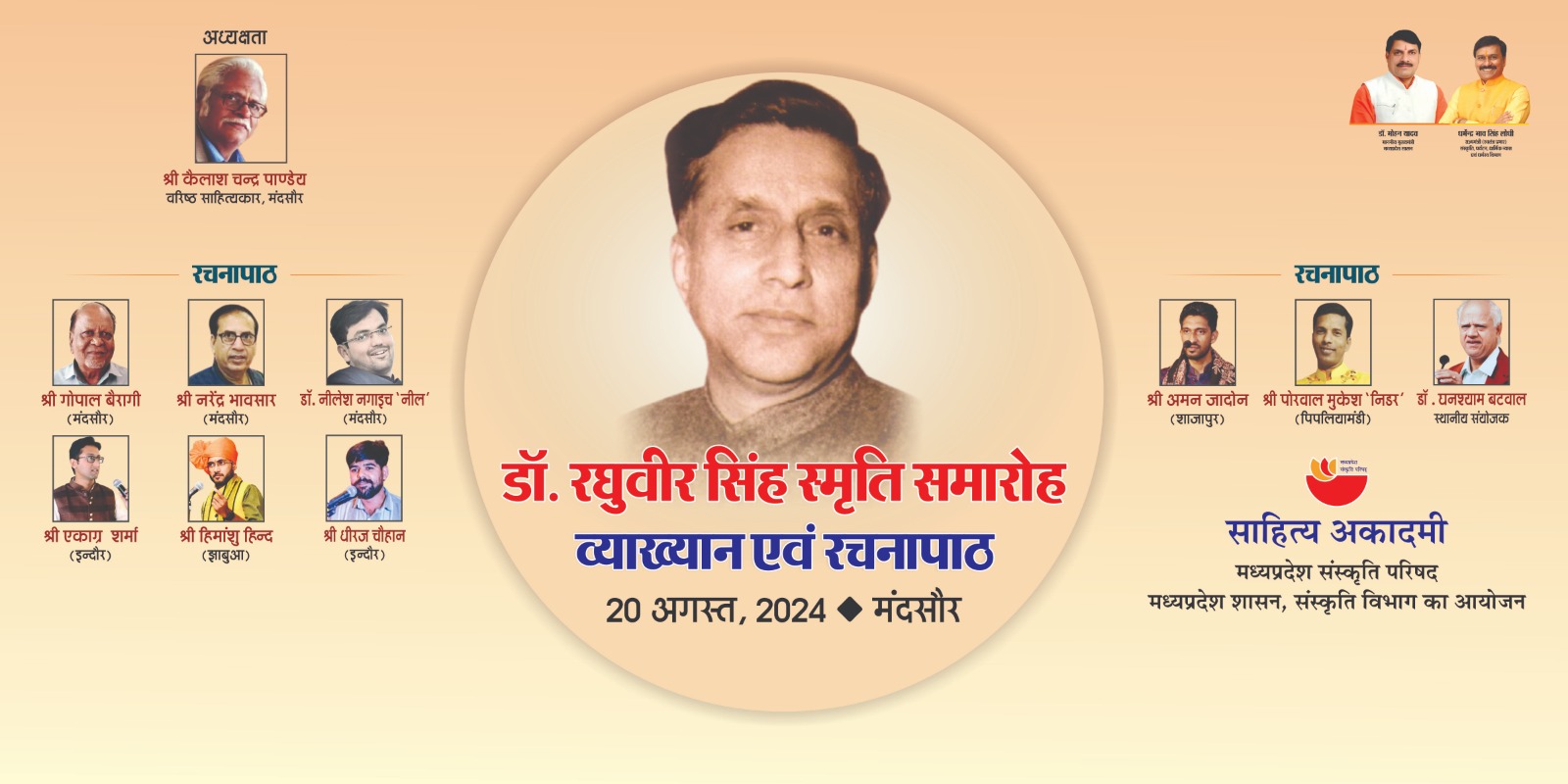 साहित्य अकादमी, मध्यप्रदेश संस्कृति परिषद्, मध्यप्रदेश शासन संस्कृति विभाग भोपाल द्वारा डॉ. रघुवीर सिंह स्मृति समारोह में ‘व्याख्यान एवं रचनापाठ’ दिनांक 20 अगस्त, 2024 को सायं 7.00 बजे नगर पालिका सभागृह, गांधी चैराहा, मंदसौर (म.प्र.) में आयोजित है। प्रथम सत्र की अध्यक्षता वरिष्ठ साहित्यकार श्री कैलाश चन्द्र पाण्डेय-मंदसौर करेंगे। कार्यक्रम के दूसरे सत्र में श्री गोपाल बैरागी-मंदसौर, श्री नरेन्द्र भावसार-मंदसौर, डॉ. नीलेश नगाइच ‘नील’-मंदसौर, श्री एकाग्र शर्मा-इंदौर, श्री हिमांशु हिन्द-झाबुआ, श्री धीरज चैहान-इंदौर, श्री अमन जादोन-शाजापुर एवं श्री पोरवाल मुकेश ‘निडर’-पिपलियामंडी अपनी-अपनी रचनाओं का पाठ करेंगे। कार्यक्रम के स्थानीय संयोजक डॉ. घनश्याम बटवाल होंगे। आयोजित व्याख्यान एवं रचनापाठ में आप सभी सादर साग्रह आमंत्रित हैं। डॉ. विकास दवे निदेशक-साहित्य अकादमी भोपाल