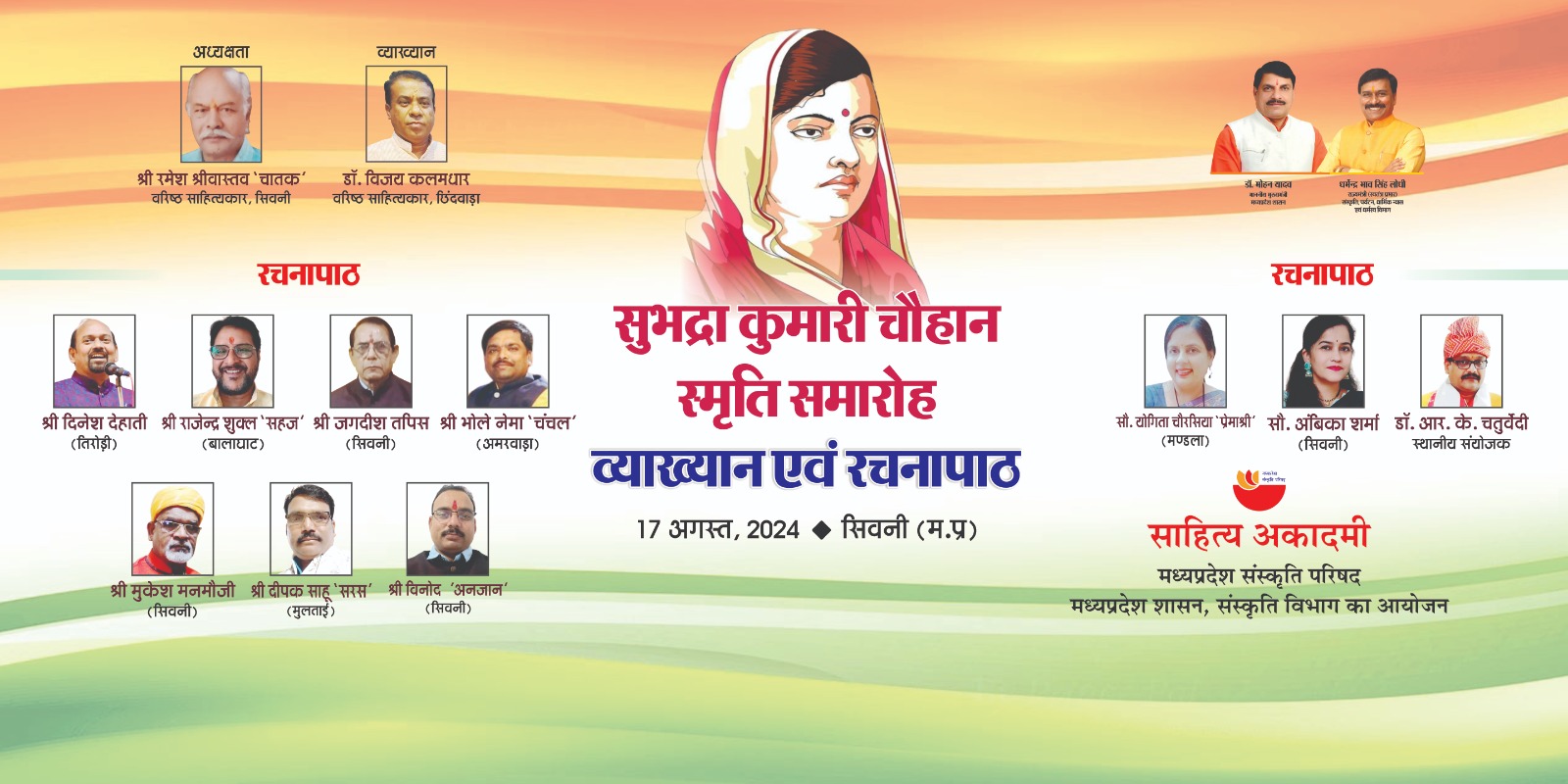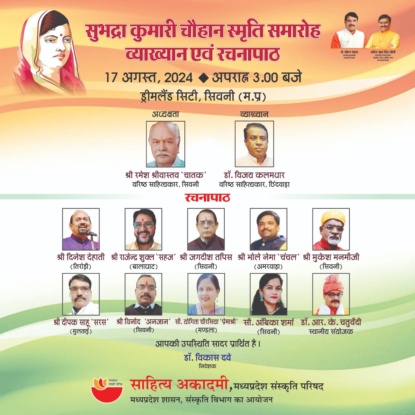 साहित्य अकादमी, मध्यप्रदेश संस्कृति परिषद्, मध्यप्रदेश शासन संस्कृति विभाग भोपाल द्वारा सुभद्रा कुमारी चैहान स्मृति समारोह में ‘व्याख्यान एवं रचनापाठ’ दिनांक 17 अगस्त, 2024 को अपराह्न 3.00 बजे से एस.एस.सी. शिक्षा महाविद्यालय, ड्रीमलैंड सिटी, सिवनी (म.प्र.) में आयोजित है। प्रथम सत्र की अध्यक्षता वरिष्ठ साहित्यकार श्री रमेश श्रीवास्तव-सिवनी करेंगे। वरिष्ठ साहित्यकार डॉ. विजय कलमधार-छिंदवाड़ा व्याख्यान देंगे। कार्यक्रम के दूसरे सत्र में श्री दिनेश देहाती ‘तिरोड़ी‘-बालाघाट, श्री राजेन्द्र शुक्ल ‘सहज’-बालाघाट, श्री जगदीश तपिश-सिवनी, श्री भोले नेमा ‘चंचल’-अमरवाड़ा, श्री मुकेश साहू ‘सरस’-मुलताई, श्री विनोद सनोदिया ‘सरस’-सिवनी, श्रीमती योगिता चैरसिया ‘प्रेमाश्री’-मण्डला एवं श्रीमती अंबिका शर्मा-सिवनी अपनी-अपनी रचनाओं का पाठ करेंगे। कार्यक्रम के स्थानीय संयोजक डॉ. आर. के. चतुर्वेदी होंगे। आयोजित व्याख्यान एवं रचनापाठ में आप सभी सादर साग्रह आमंत्रित हैं। डॉ. विकास दवे निदेशक-साहित्य अकादमी भोपाल