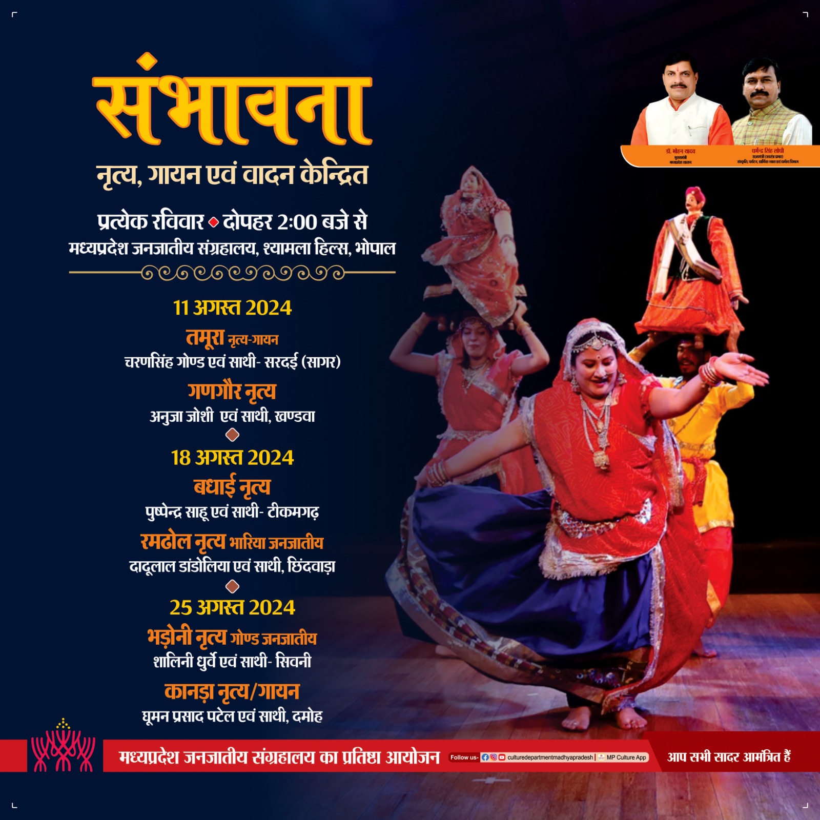 संभावना नृत्य, गायन एवं वादन केन्द्रित दोपहर 2:00 बजे से प्रत्येक रविवार मध्यप्रदेश जनजातीय संग्रहालय, श्यामला हिल्स, भोपाल मध्यप्रदेश जनजातीय संग्रहालय का प्रतिष्ठा आयोजन