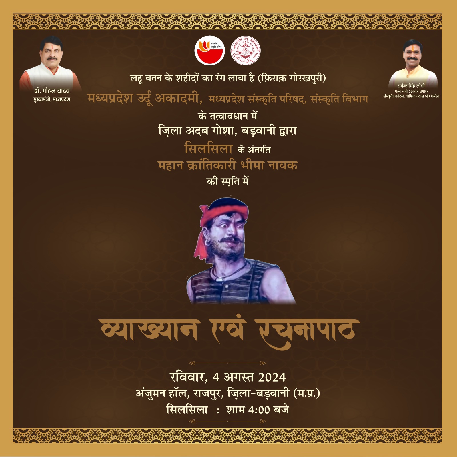 #Badwani #Silsila #mpurduacademy #mpculturedeptt लहू वतन के शहीदों का रंग लाया है (फ़िराक़ गोरखपुरी) मध्यप्रदेश उर्दू अकादमी, मध्यप्रदेश संस्कृति परिषद, संस्कृति विभाग के तत्वावधान में ज़िला अदब गोशा, बड़वानी द्वारा सिलसिला के अंतर्गत महान क्रांतिकारी भीमा नायक की स्मृति में व्याख्यान एवं रचनापाठ रविवार, 4 अगस्त 2024 अंजुमन हॉल, राजपुर, जिला-बड़वानी (म.प्र.) सिलसिला : शाम 4:00 बजे विशिष्ट आमंत्रित वक्ता एवं शायर सिराज तन्हा (अलीराजपुर) सिलसिला में आमंत्रित स्थानीय वक्ता एवं शायर वक्ता :- बलदेव सिंह चौहान दरबार शायर एवं साहित्यकार (विषय: भीमा नायक व्यक्तित्व एवं कृतित्व) शायर :- आरिफ़ अहमद 'आरिफ़' (बड़वानी), इस्लामुद्दीन 'हैदर', शुजाउद्दीन 'बेबाक' (ओझर) वाजिद हुसैन 'साहिल', निज़ाम 'बाबा' (सेंधवा), समीर खान 'समीर', अपूर्व शुक्ल 'हिन्दुस्तानी', विशाल त्रिवेदी 'आदिल', हाफ़िज़ अहमद 'हाफ़िज़', शाकिर शेख 'शाकिर' (सेंधवा) वाहिद कुरैशी 'वाहिद' (राजपुर), पवन शर्मा हमदर्द (सेंधवा), शाहरूख़ शाद (पलसूद) जिला समन्वयक : सैयद रिज़वान अली (राजपुर) आप सभी सादर साग्रह आमंत्रित हैं डॉ. नुसरत मेहदी निदेशक