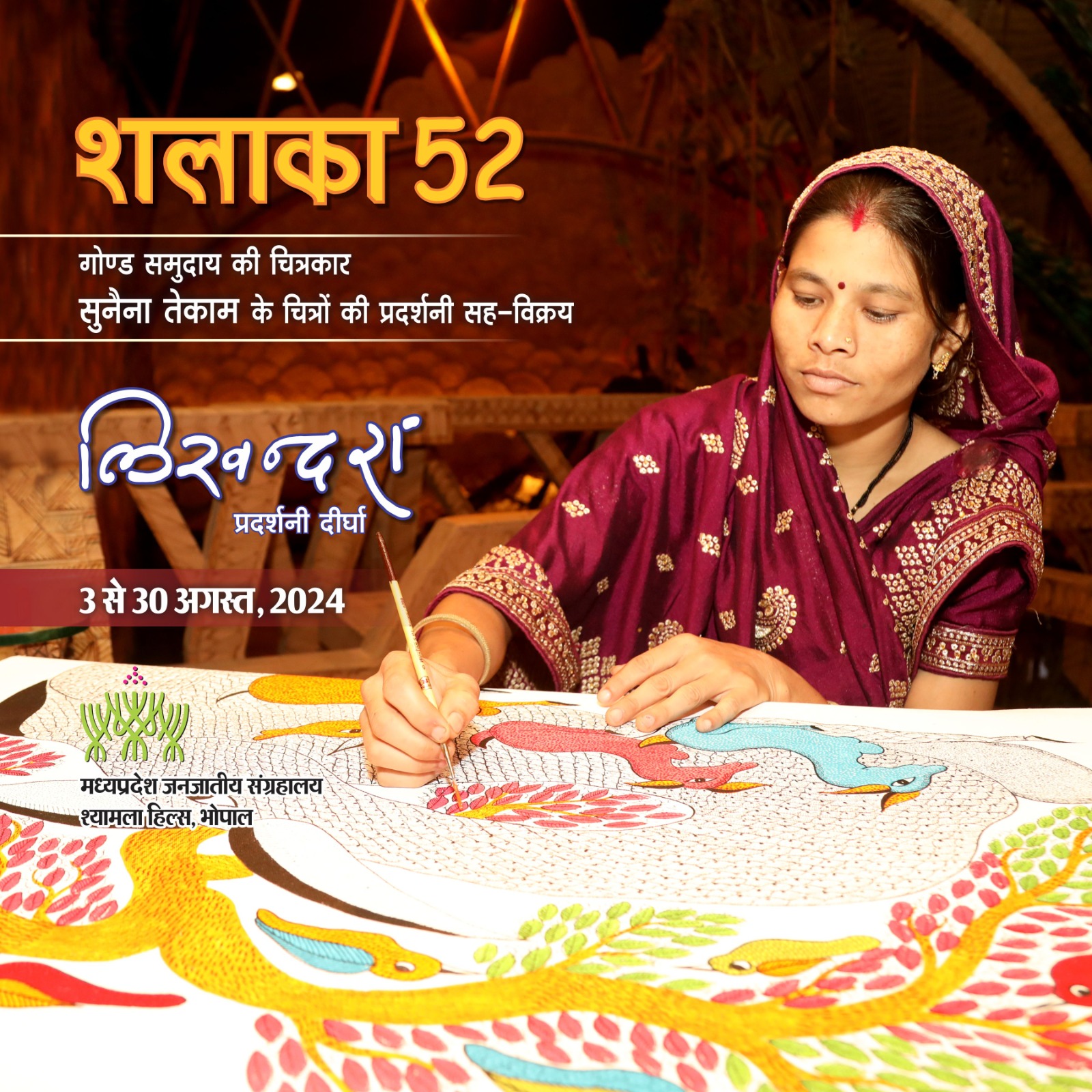 शलाका 52 गोण्ड समुदाय की चित्रकार सुश्री सुनैना तेकाम के चित्रों की प्रदर्शनी सह-विक्रय लिखन्दरा प्रदर्शनी दीर्घा 3 से 30 Aug, 2024 मध्यप्रदेश जनजातीय संग्रहालय श्यामला हिल्स, भोपाल