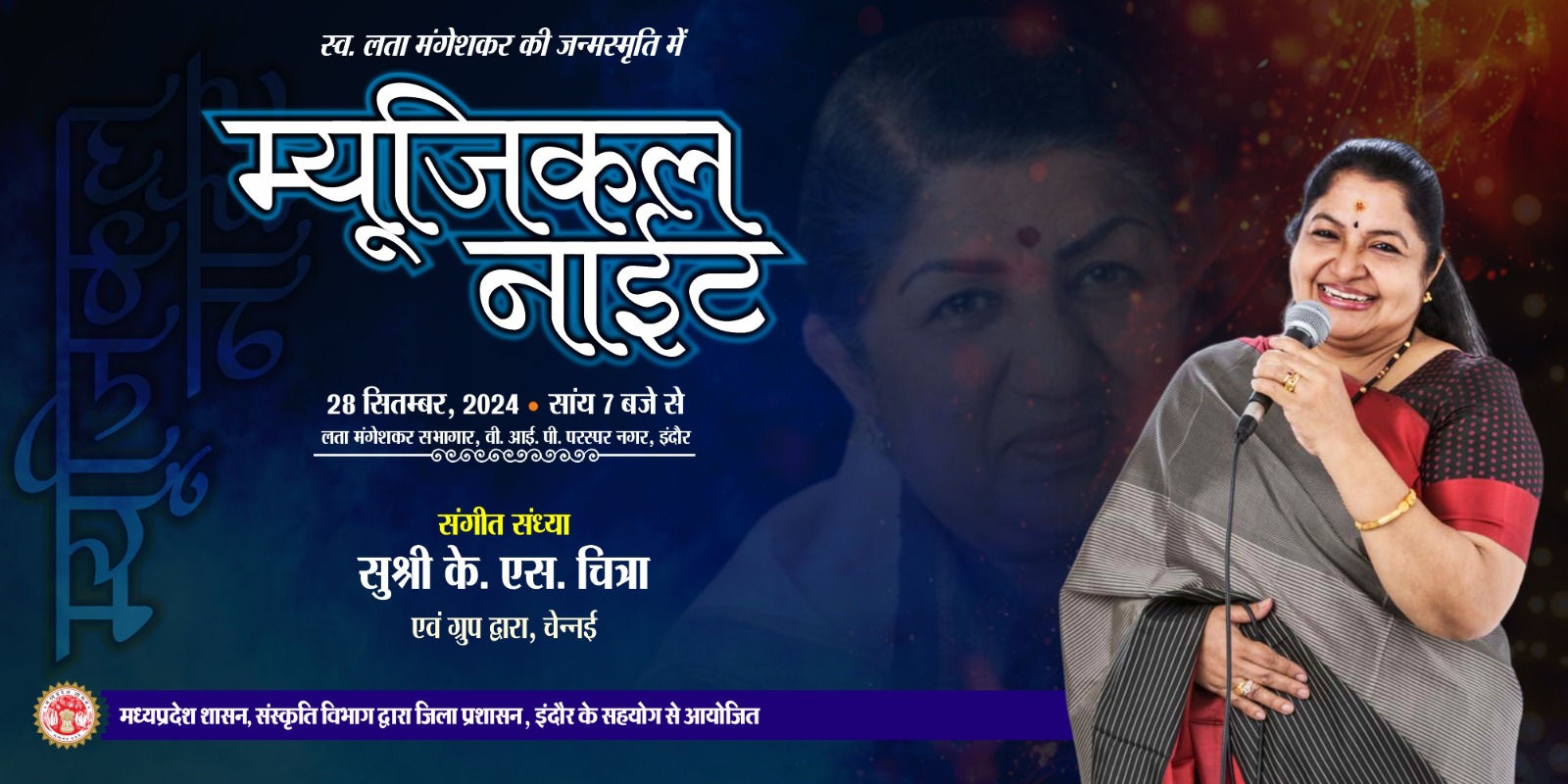 स्व. लता मंगेशकर जी की स्मृति में गीत-संगीत संध्या 28 सितम्बर, 2024 सायं 7.00 बजे से , स्थान- लता मंगेशकर ऑडिटोरियम, इंदौर आमंत्रित कलाकार - के. एस. चित्रा एवं ग्रुप, चेन्नई