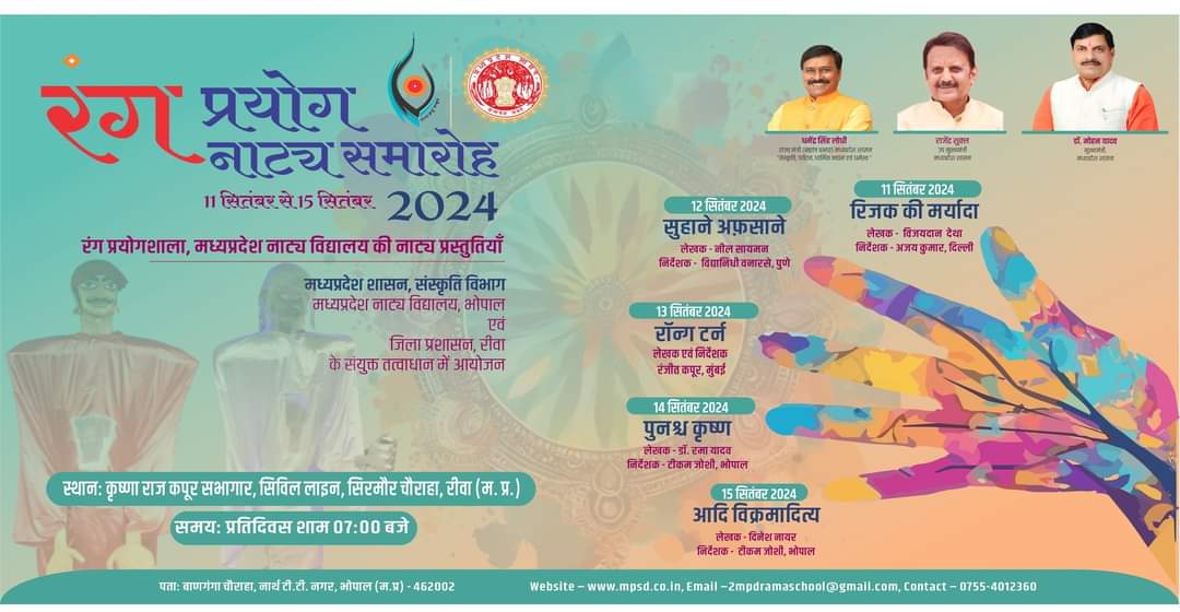 रंग प्रयोग नाटय समारोह 11-15 सितम्बर स्थान- कृष्णा राज कपूर सभागार, सिविल लाइन, सिरमौर चौराहा, रीवा (म.प्र.) समय- सांय-07.00 बजे ,11 सितंबर 2024 रिजक की मर्यादा लेखक विजयदान देथा निर्देशक अजय कुमार, दिल्ली 12 सितंबर 2024 सुहाने अफ़साने लेखक नील सायमन निर्देशक विद्यानिधी वनारसे, पुणे 13 सितंबर 2024 रॉन्ग टर्न लेखक एवं निर्देशक रंजीत कपूर, मुंबई 14 सितंबर 2024 पुनश्च कृष्ण लेखक डॉ. रमा यादव निर्देशक टीकम जोशी, भोपाल 15 सितंबर 2024 आदि विक्रमादित्य लेखक दिनेश नायर निर्देशक टीकम जोशी, भोपाल